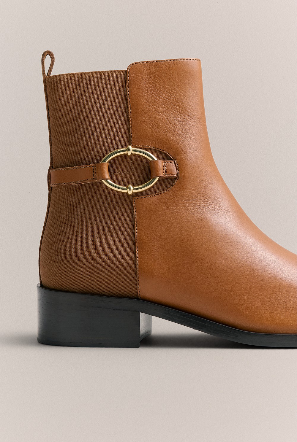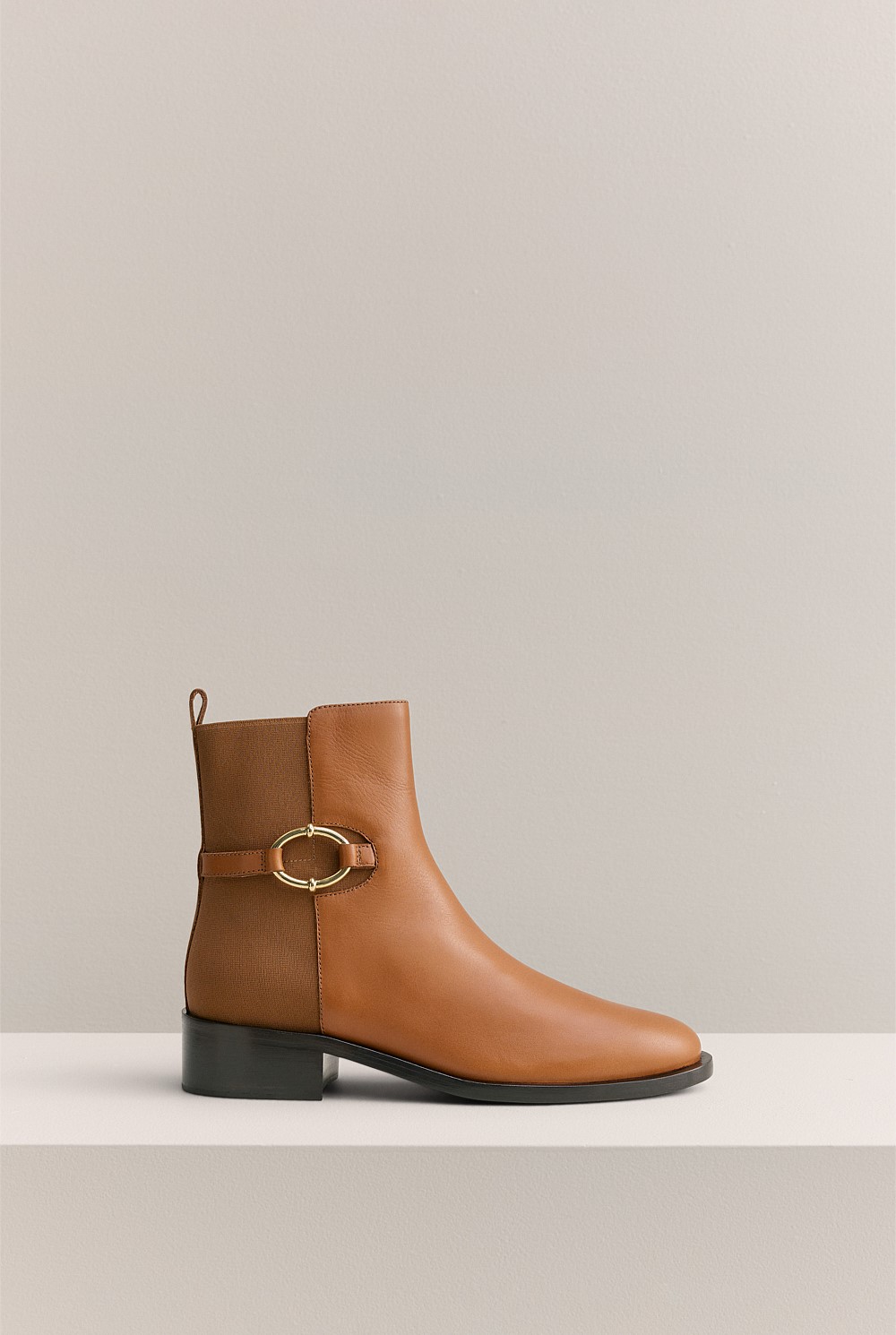 The Arakoon boot is crafted from leather and set on a low block heel with stretch gusset panels. It's adorned with our Signature Link buckle for a touch of timeless polish.