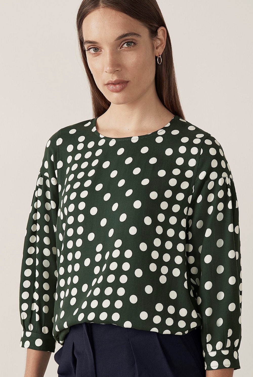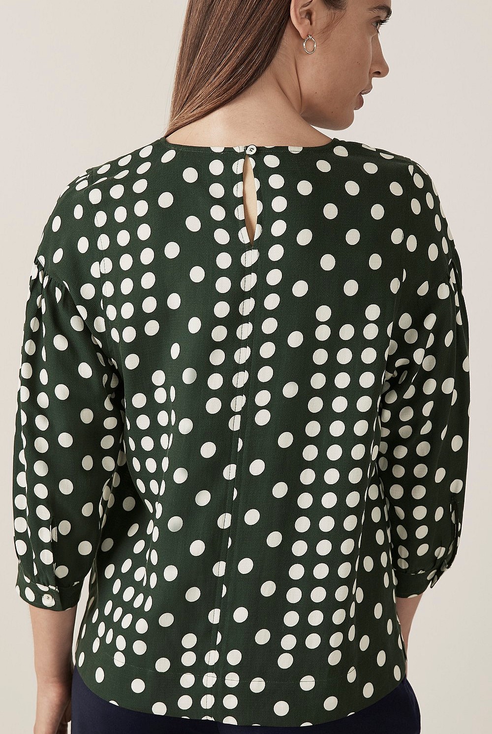 Spots will always be in style. This feminine blouse highlights this timeless print with 3/4 sleeves, a round neck and a keyhole detail at the back. Crafted in pure Tencel to sit smoothly on the skin, style this forest green blouse with cropped trousers and a tailored blazer for a refreshed workwear look.
