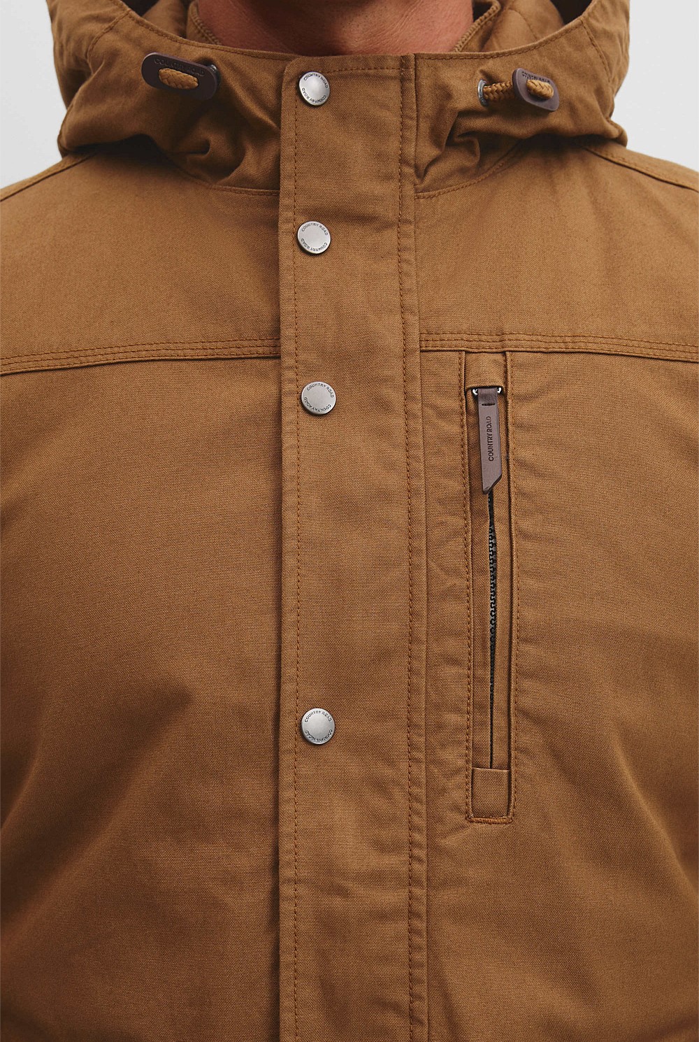 - Branded leather trims at hood and front chest pocket