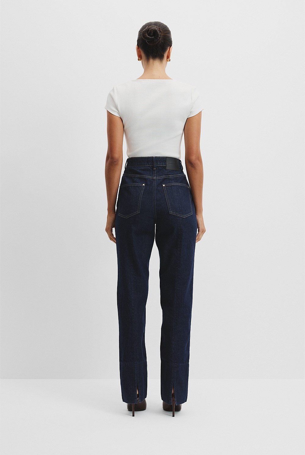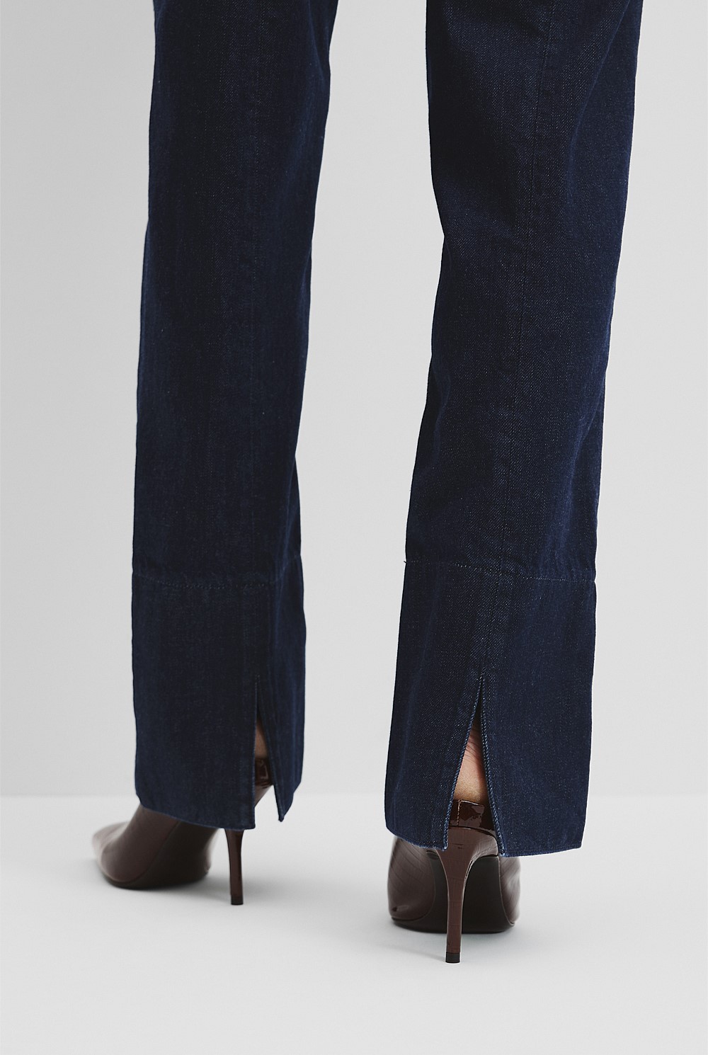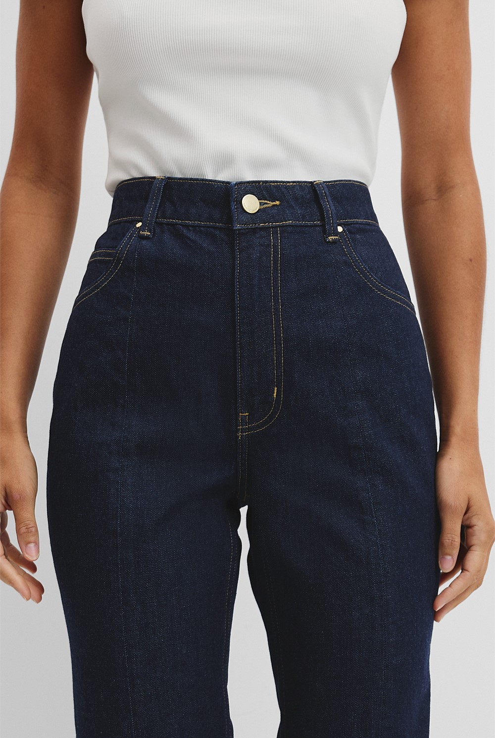Cut in a high rise silhouette, it features a straight, slim leg silhouette with panel detailing and classic five pocket styling.