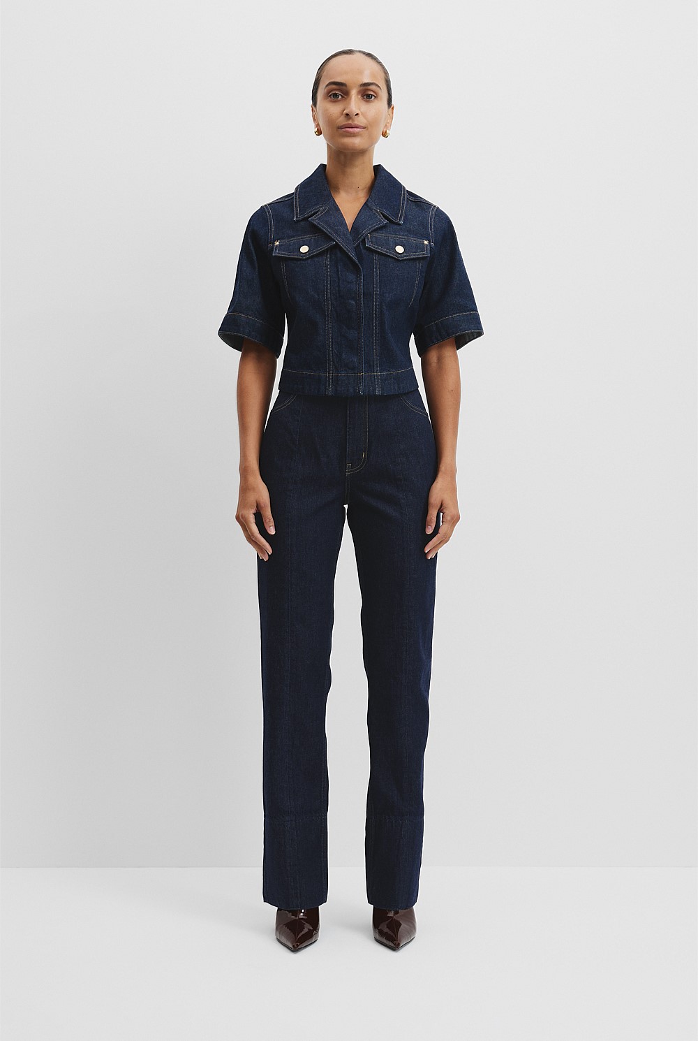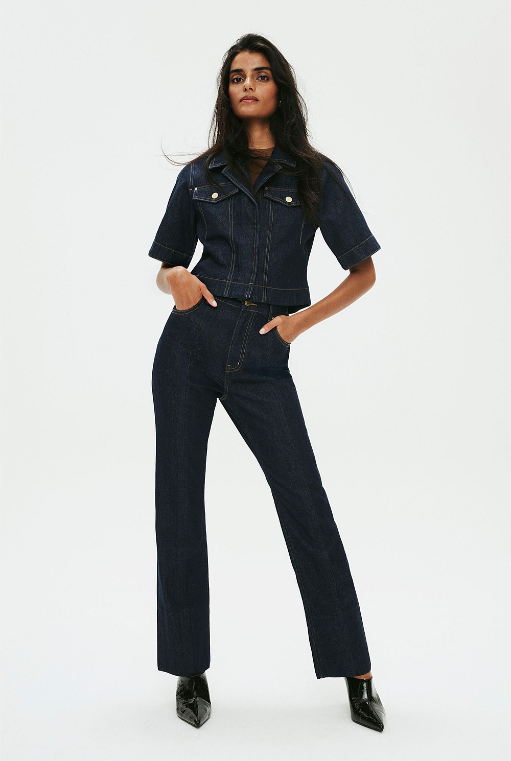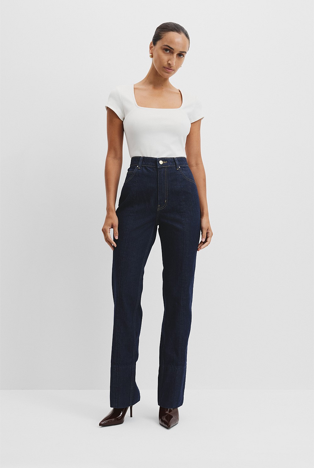 Cut in a high rise silhouette, it features a straight, slim leg silhouette with panel detailing and classic five pocket styling.