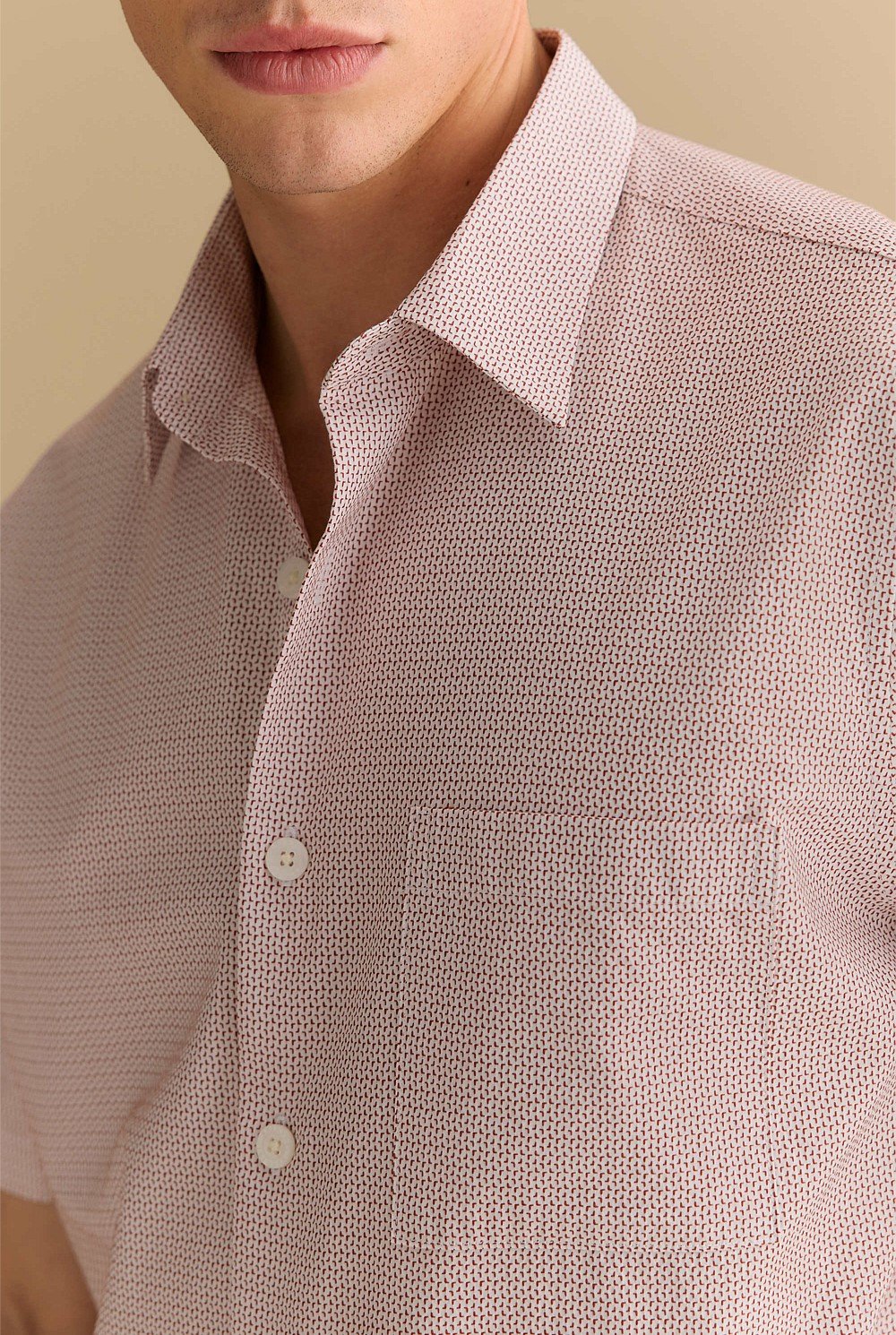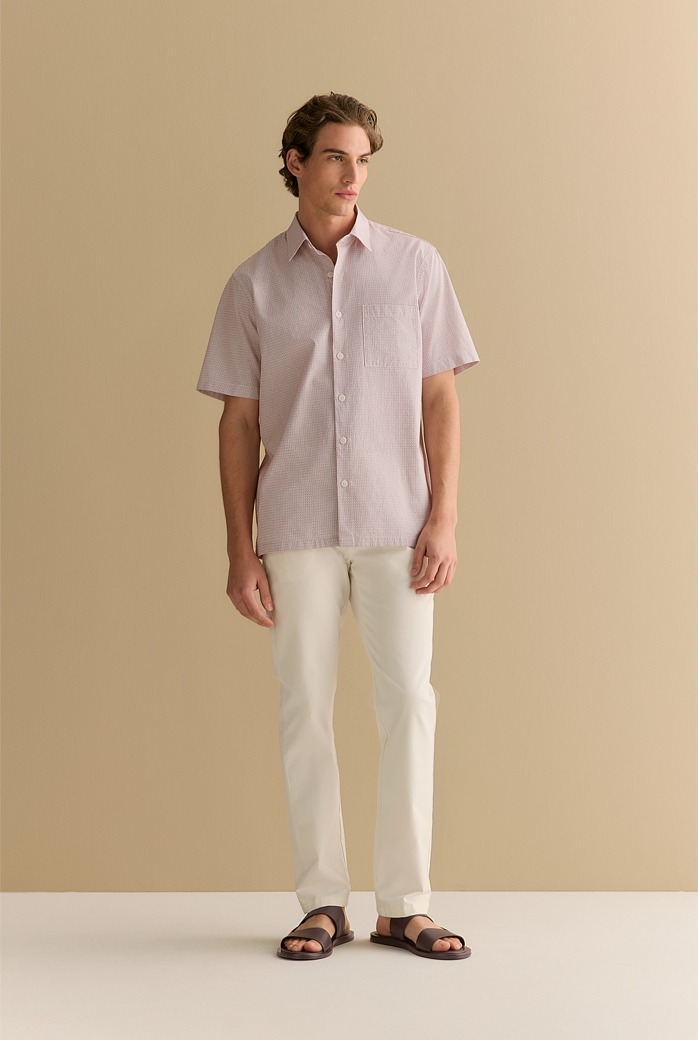 This shirt features a classic fit and short sleeve, crafted from dobby cotton for subtle yet impactful texture. Perfect to style with our white chino and sandals.
