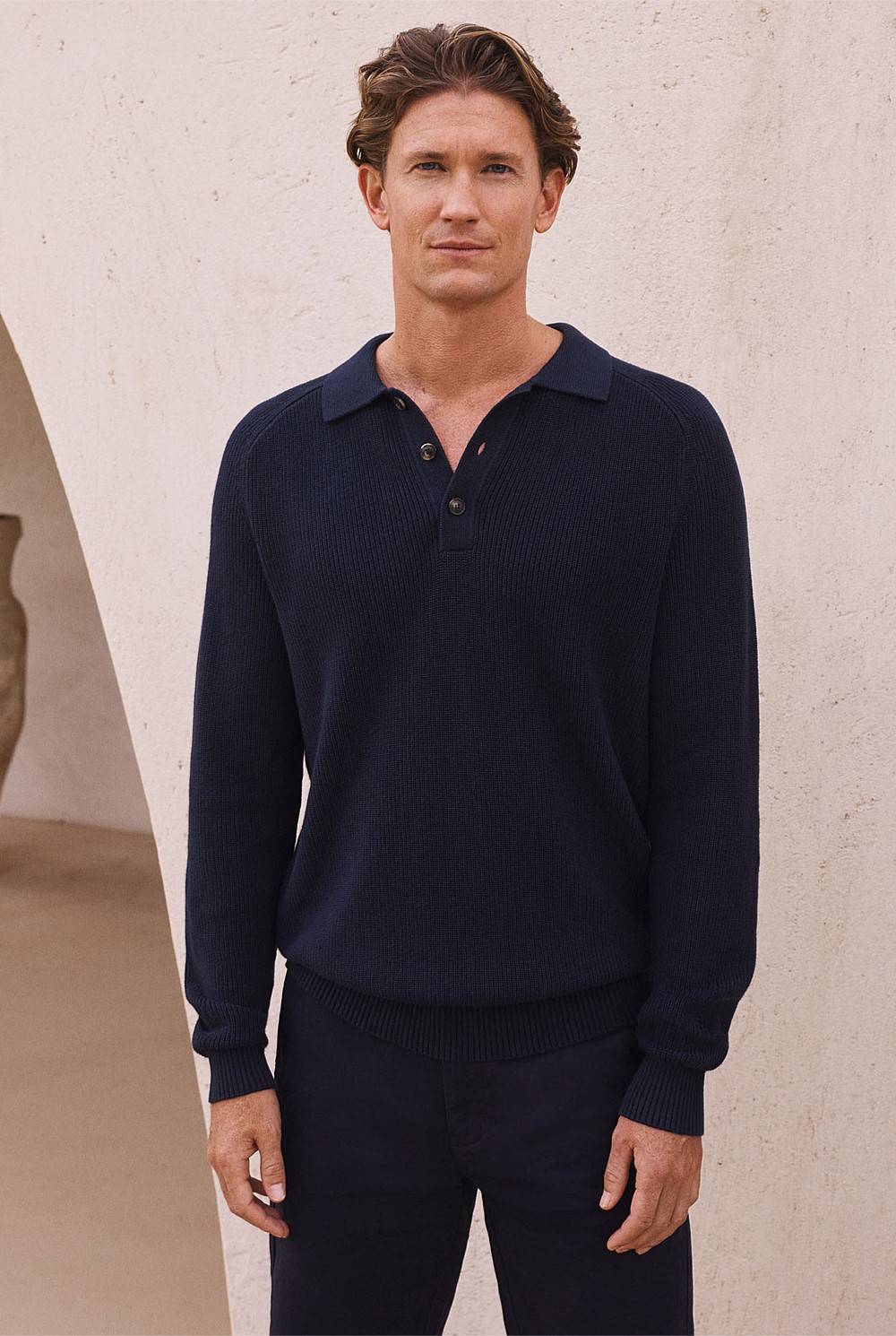 This midweight knit is made from cotton yarn, knitted in a half cardigan stitch for cosy texture with a breathable feel. Featuring a polo collar and contrast mock horn buttons.
