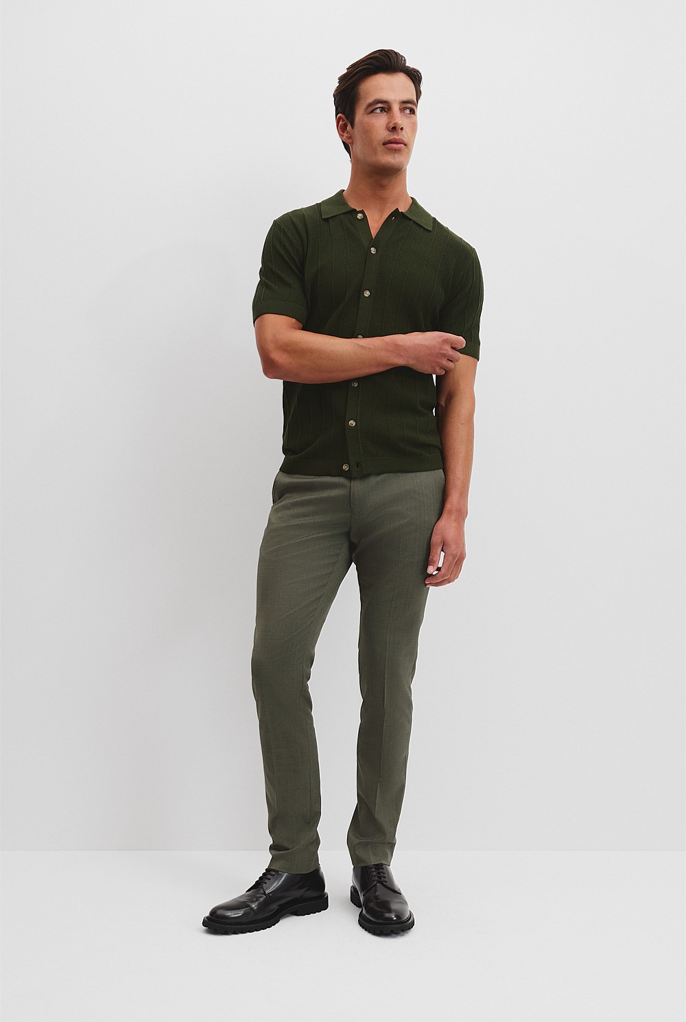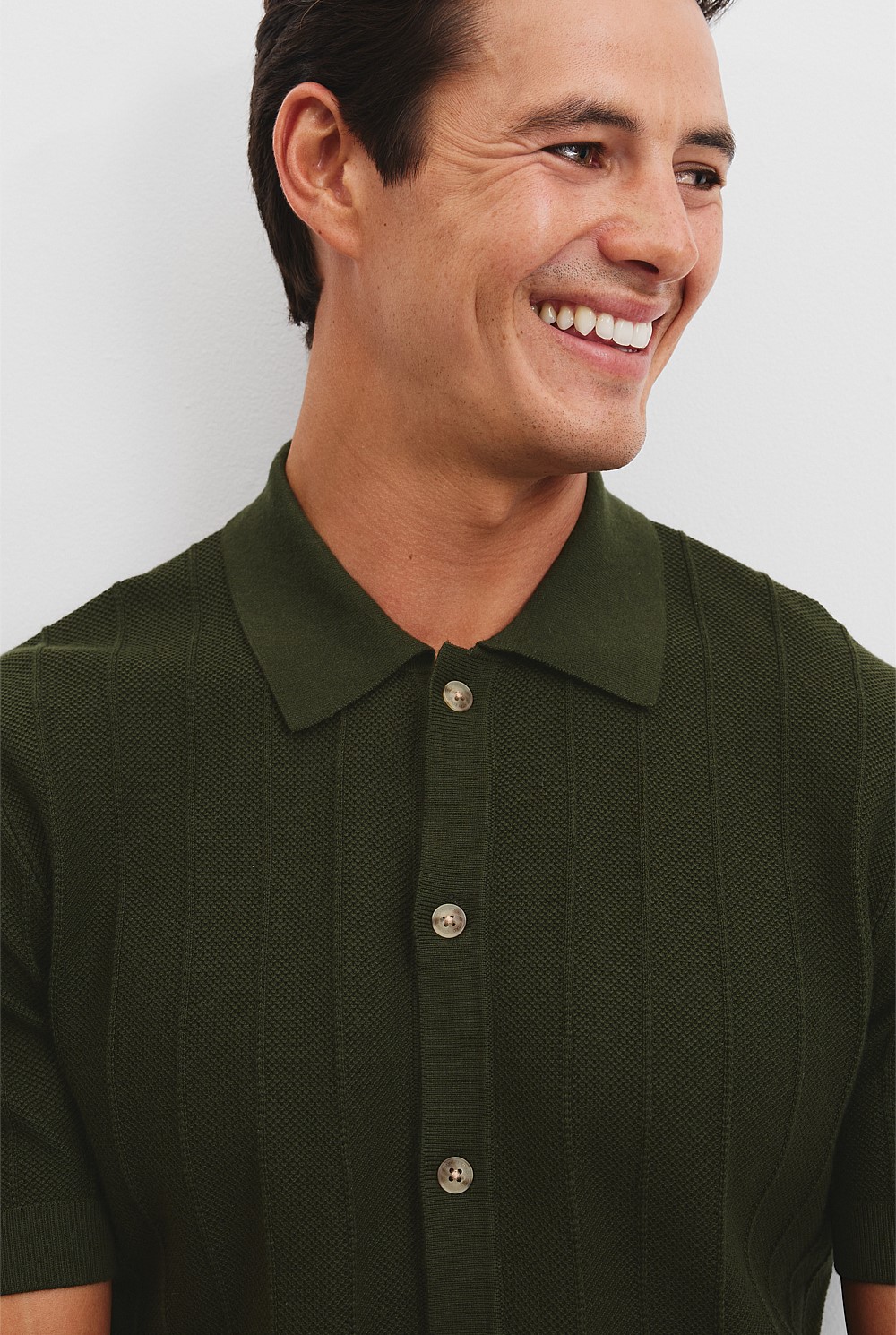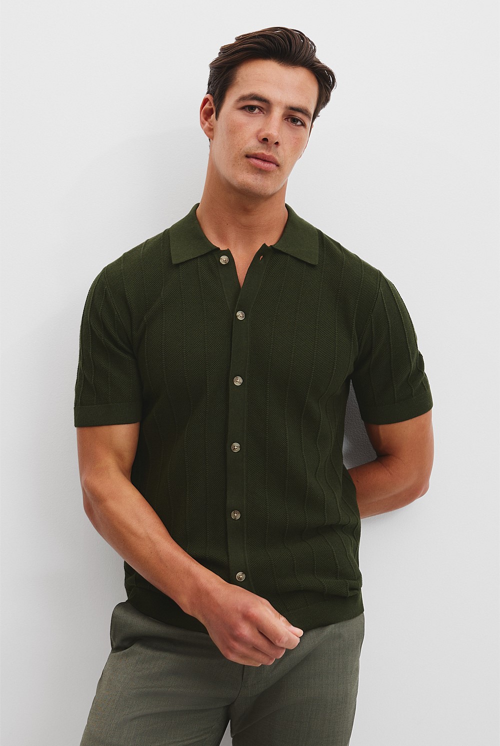 A short sleeve knitted shirt in a cotton-silk blend with a hint of cashmere. Designed in a fine-gauge striped stitch, it features branded buttons and ribbing at the cuffs and hem.