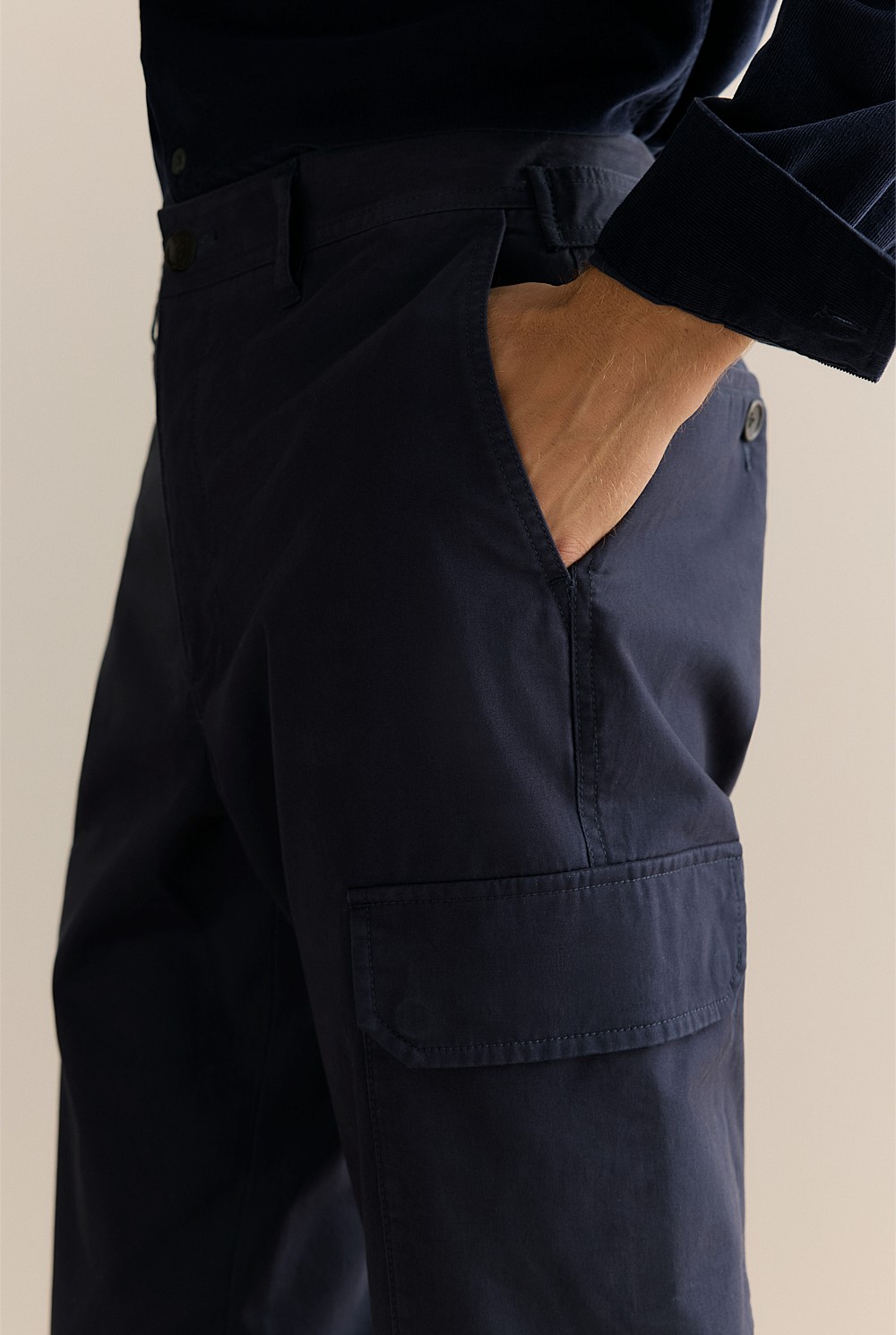 A modern take on the cargo pant, crafted from durable cotton twill with a touch of stretch for comfort. Adjustable waist tabs and concealed buttoned pockets complete the utility-inspired look.
