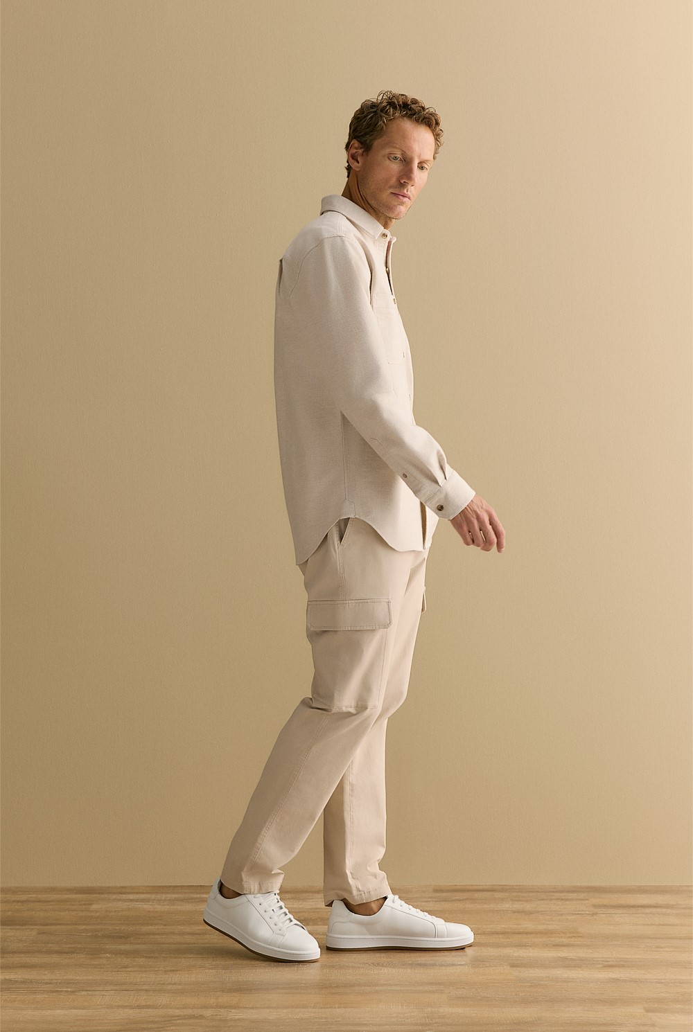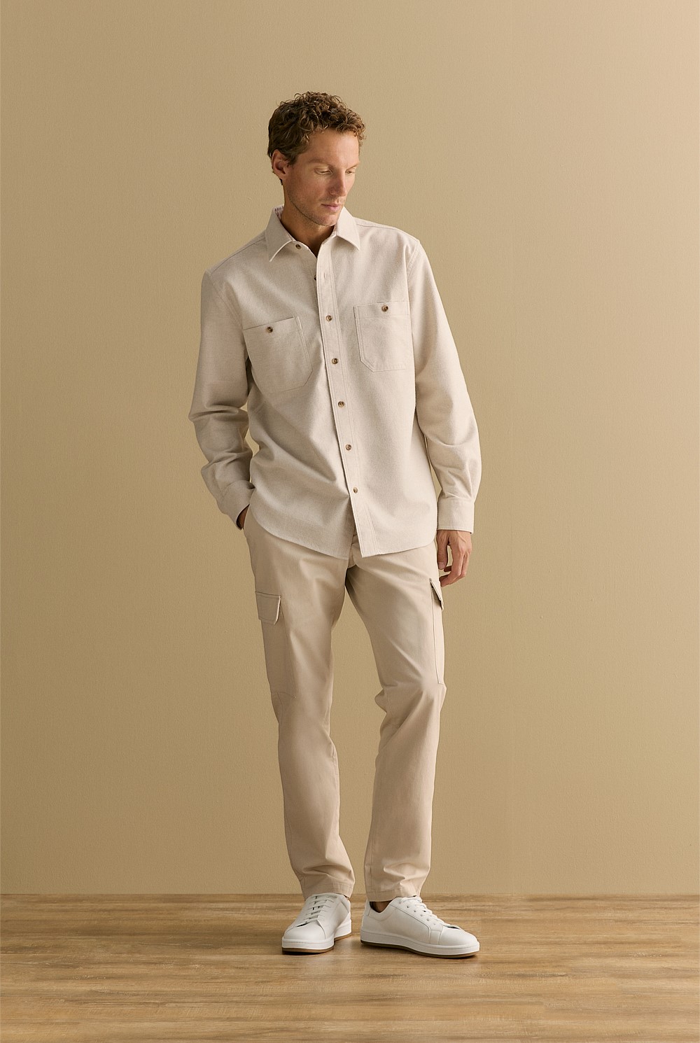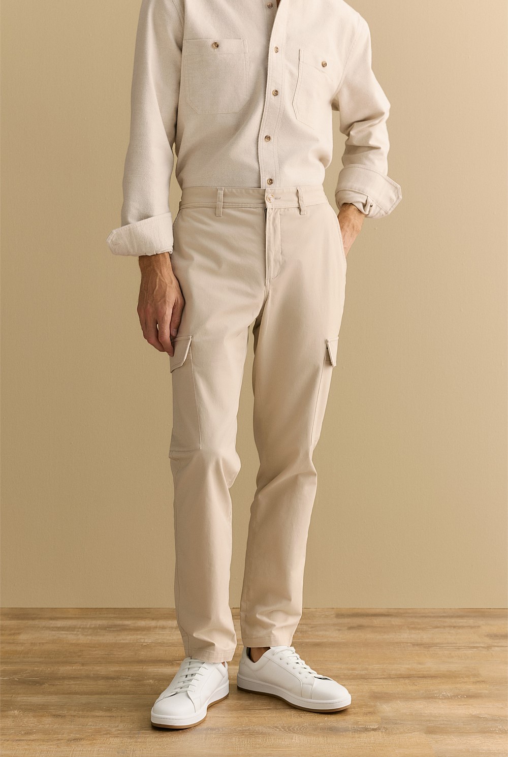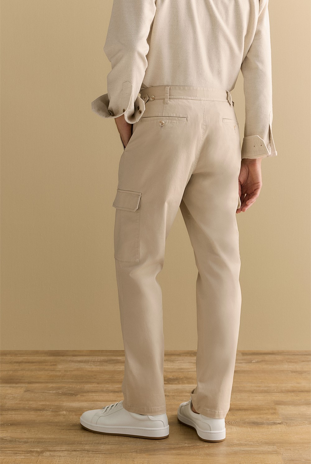 A modern take on the cargo pant, crafted from durable cotton twill with a touch of stretch for comfort. Adjustable waist tabs and concealed buttoned pockets complete the utility-inspired look.