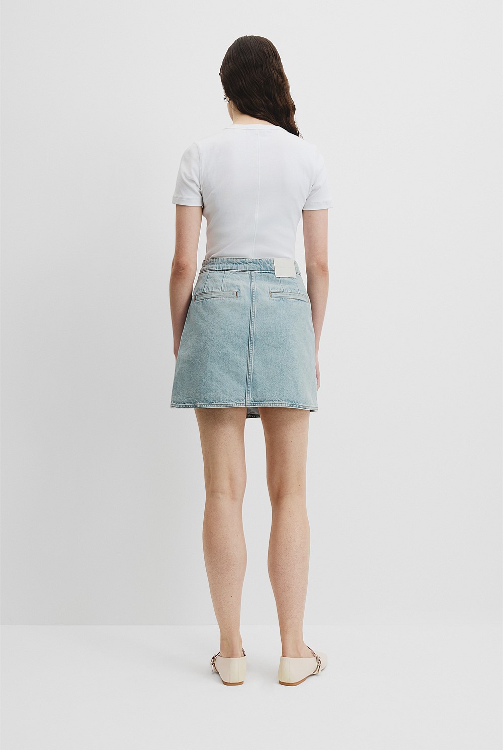 This mid-weight denim skirt is a timeless wardrobe staple, designed with a wrap-front and flattering A-line silhouette. It features patch pockets at the hip and contrast stitch detailing.