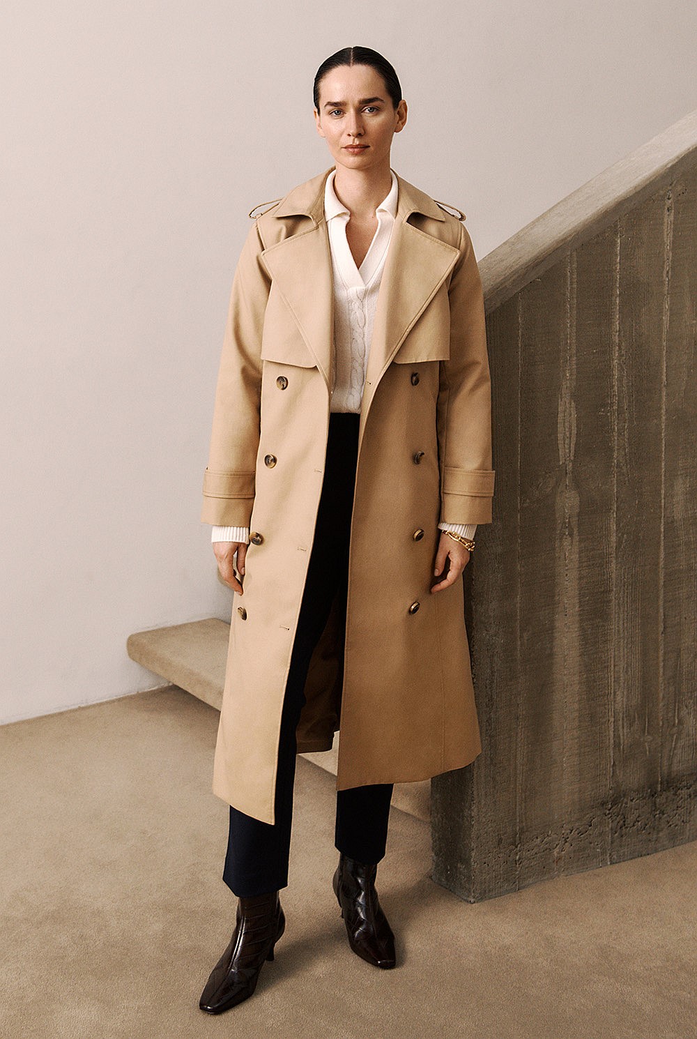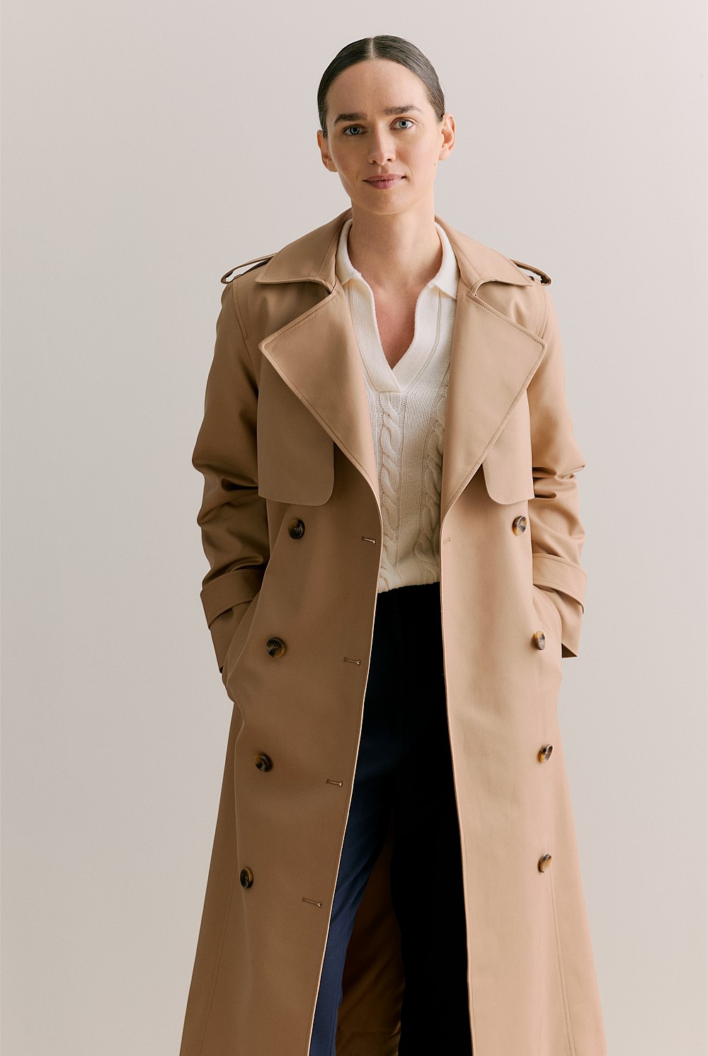 Made from structured cotton double cloth, this trench coat balances heritage detailing with a modern, streamlined silhouette.