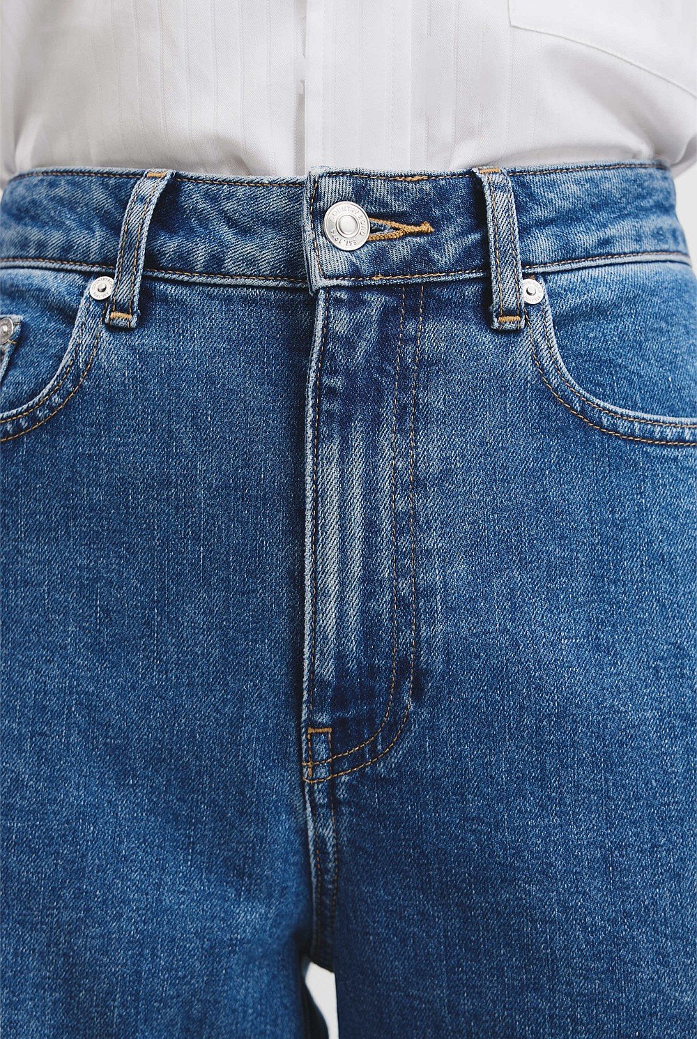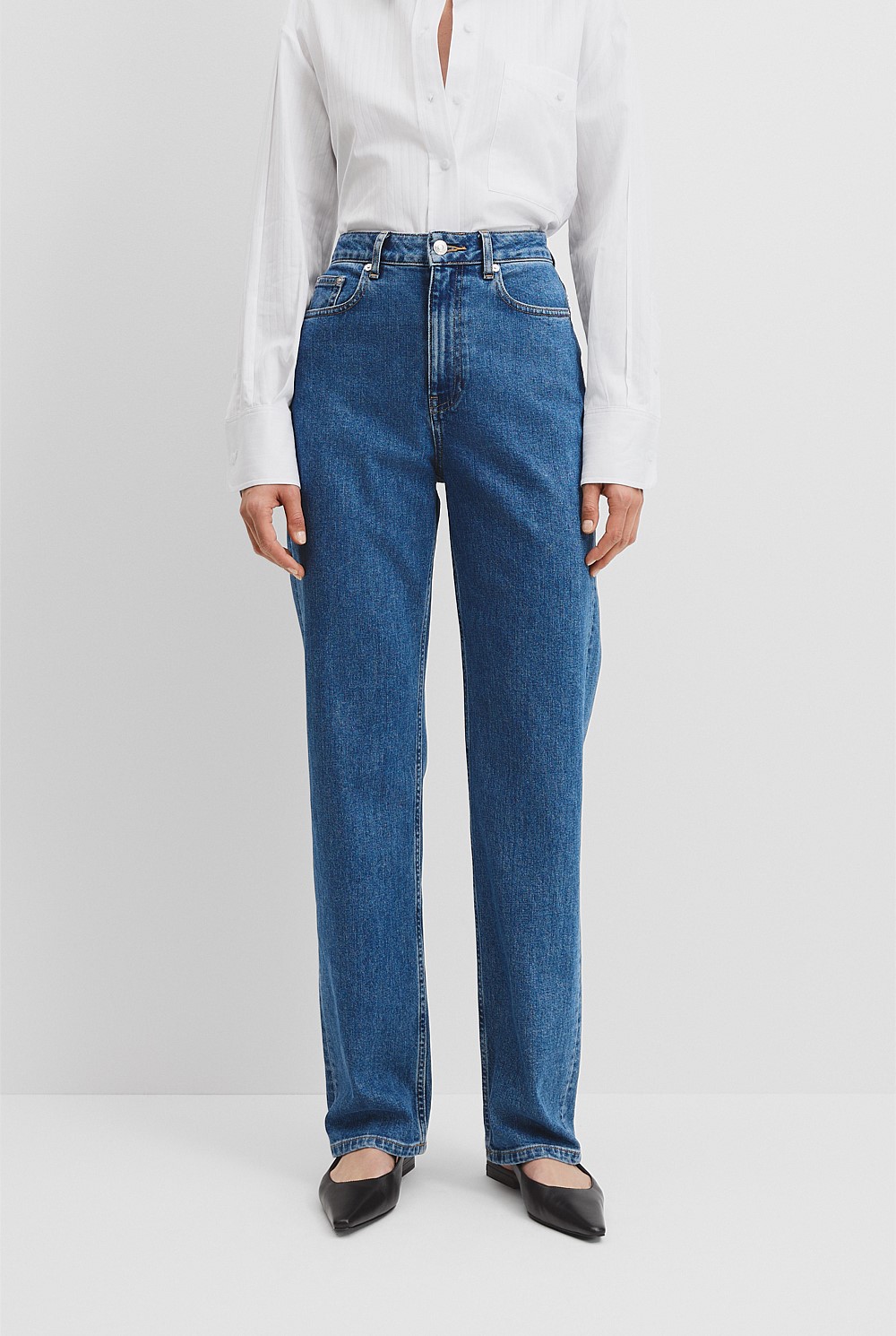 This jean has a flattering high-rise waist and a straight-leg silhouette. It features a fly front, five-pocket styling and a hint of stretch for comfort.