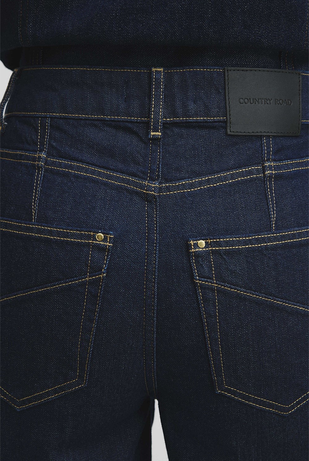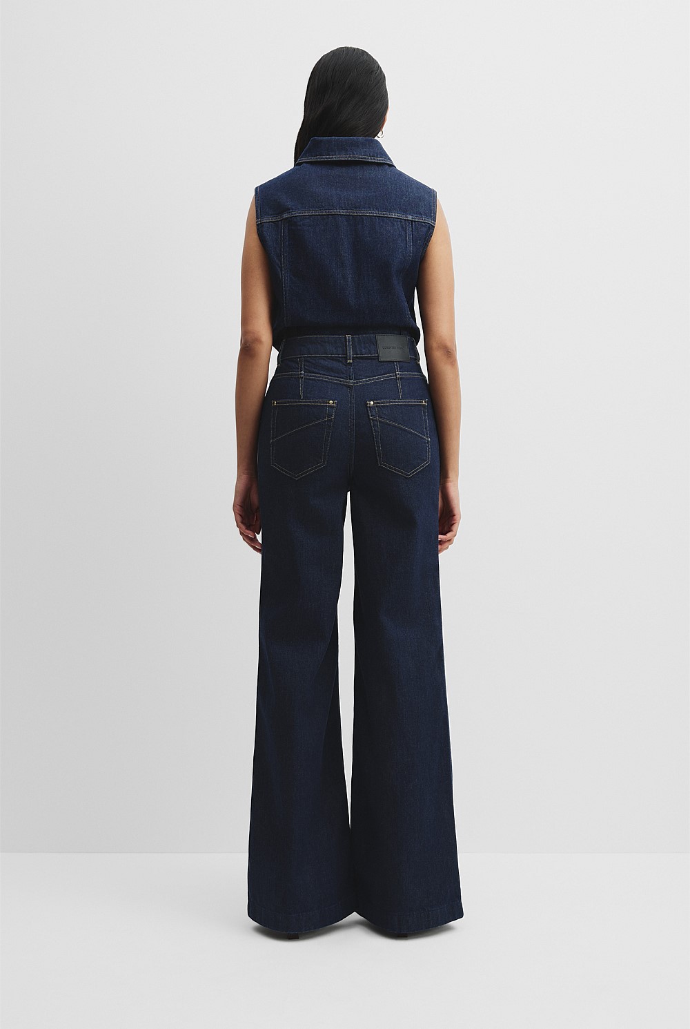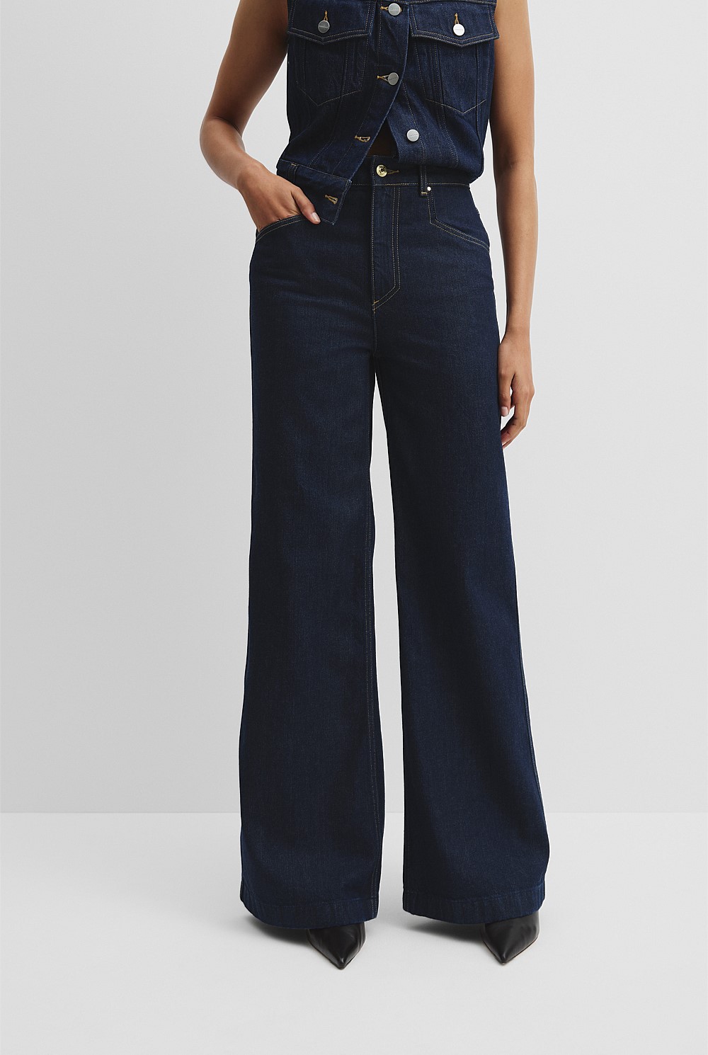 This style has a high rise waist and wide leg silhouette. Designed in our comfort stretch denim, it's fitted through the waist, with a zip fly and hook-and-bar closure.