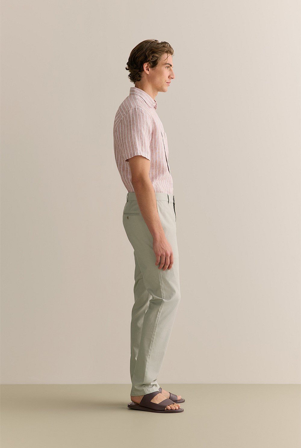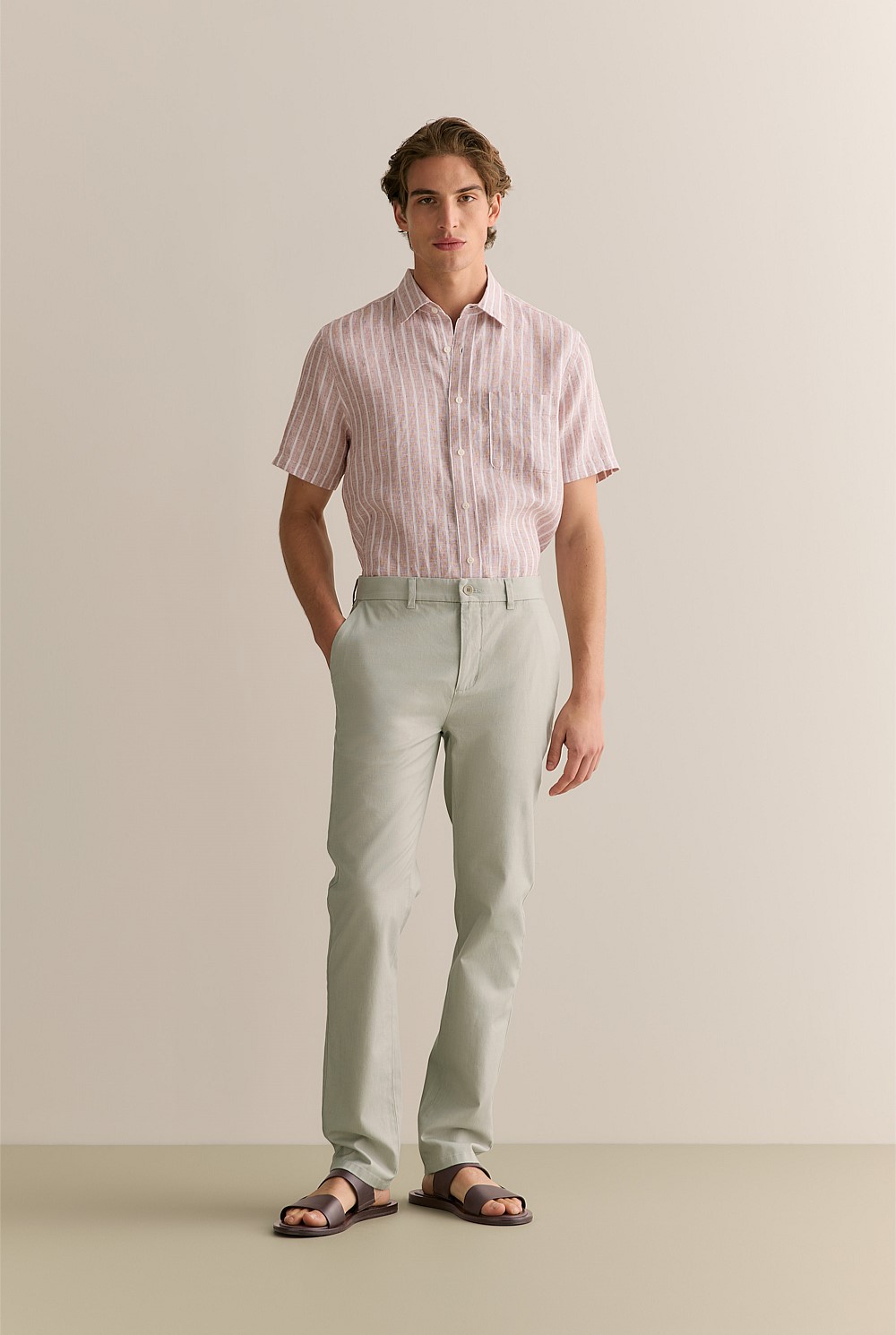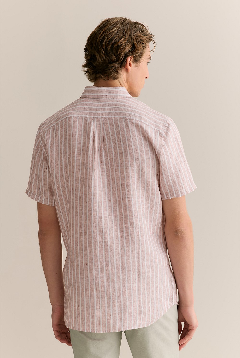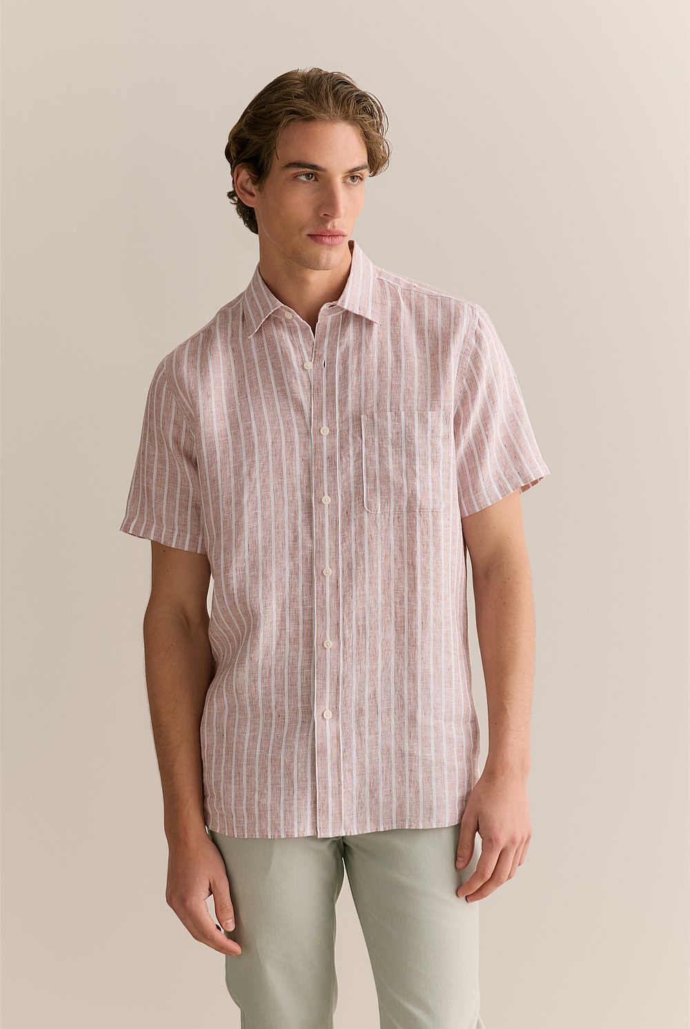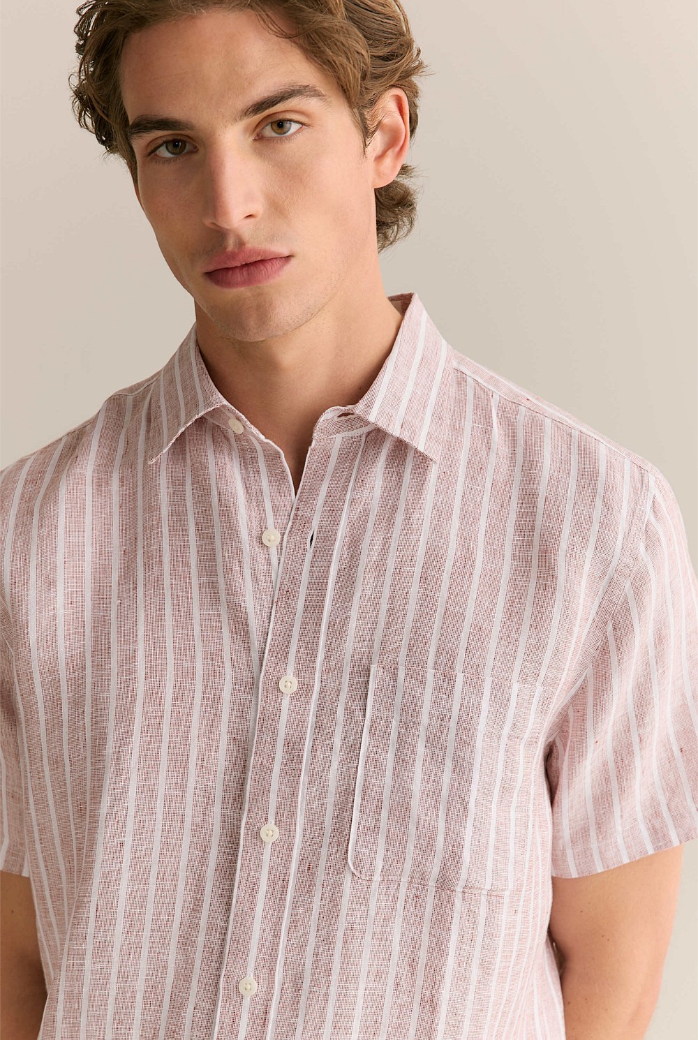 Meticulously woven from French linen with a bold stripe, our short-sleeve shirt is striking in its simplicity.