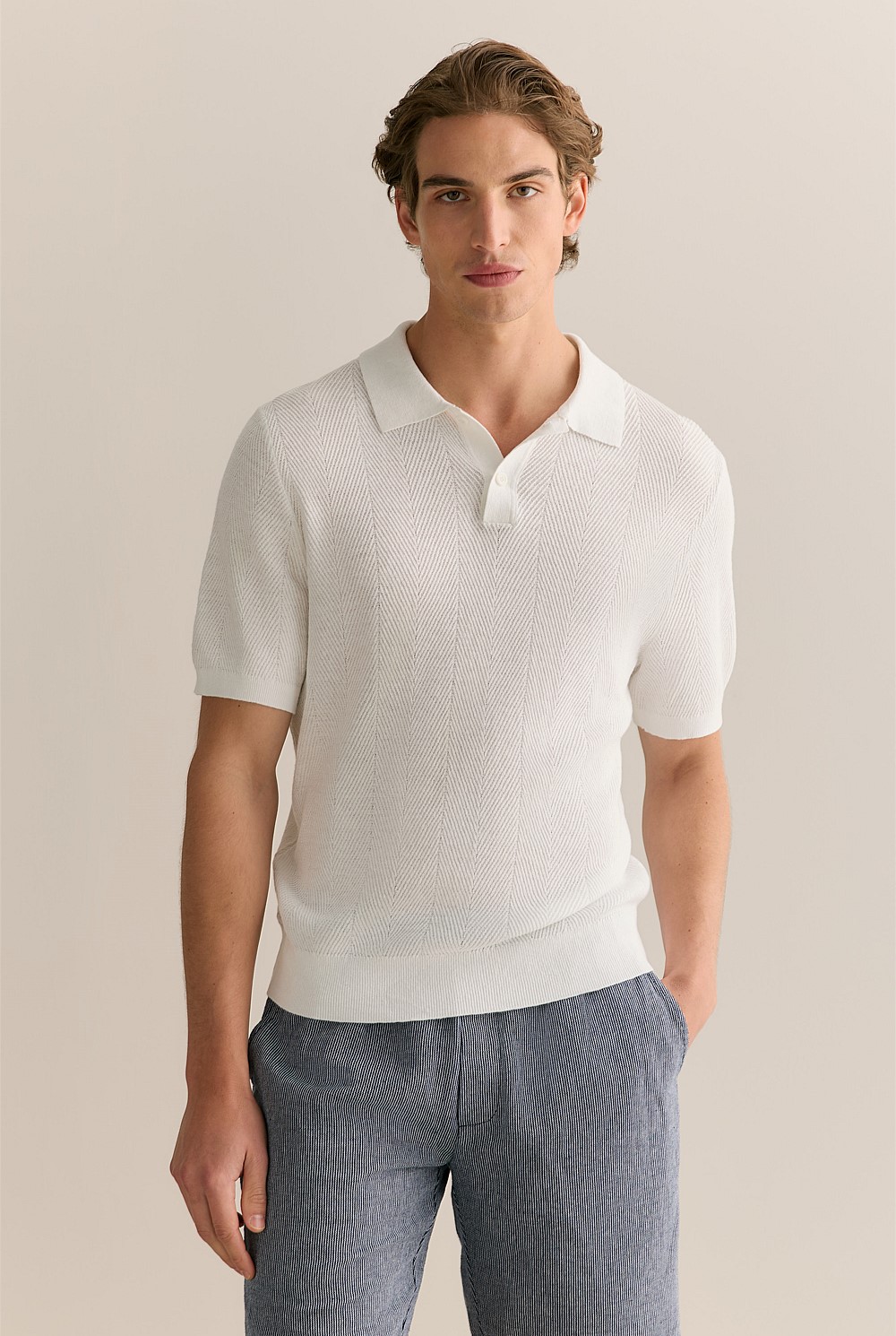 Lightweight and comfortable, this polo is crafted from a breathable linen-cotton blend, accented with a chevron stripe and refined rib trim.