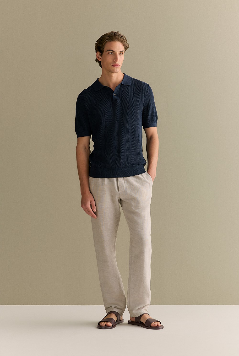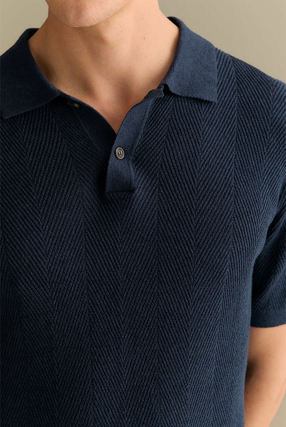 Lightweight and comfortable, this polo is crafted from a breathable linen-cotton blend, accented with a chevron stripe and refined rib trim.