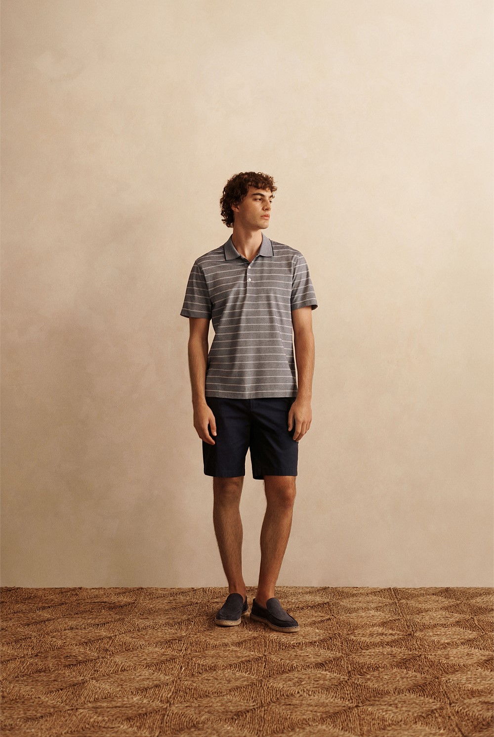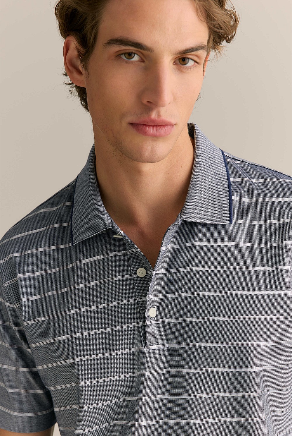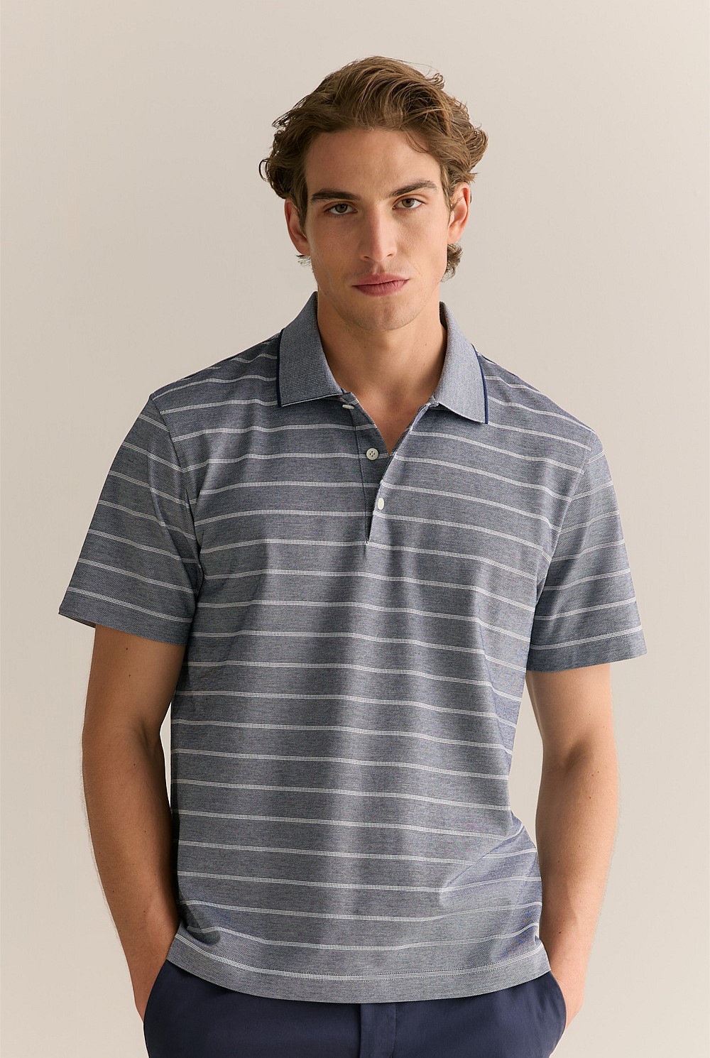 Our polo is knitted from soft mercerised cotton with a birdseye stripe design, featuring a tipped collar and eased fit for maximum versatility.
