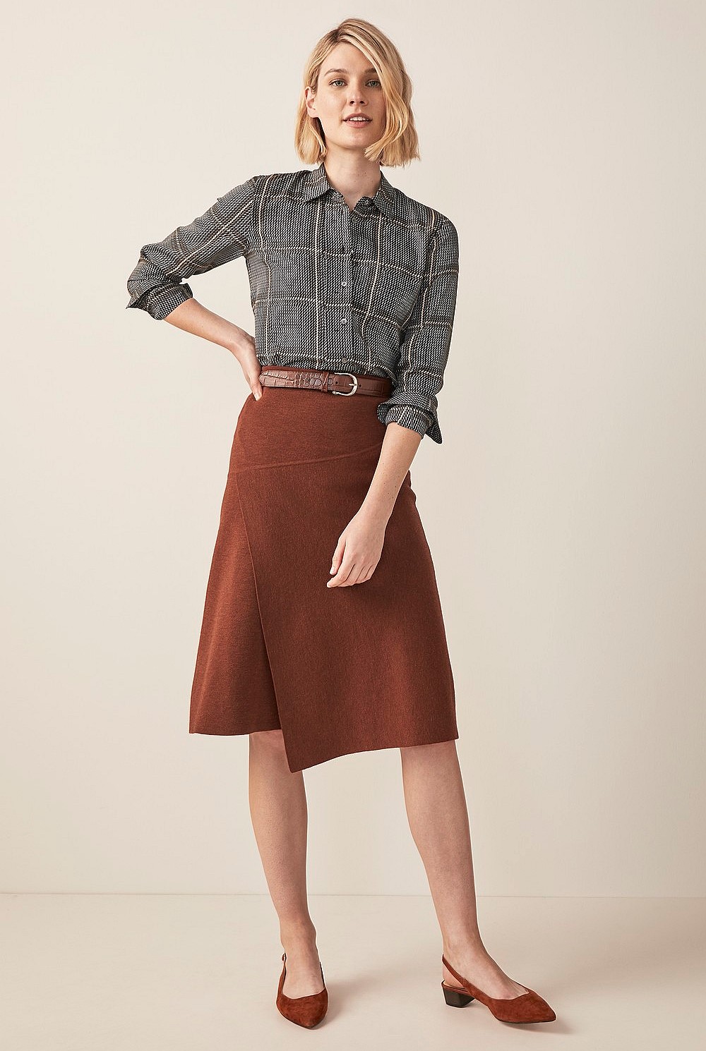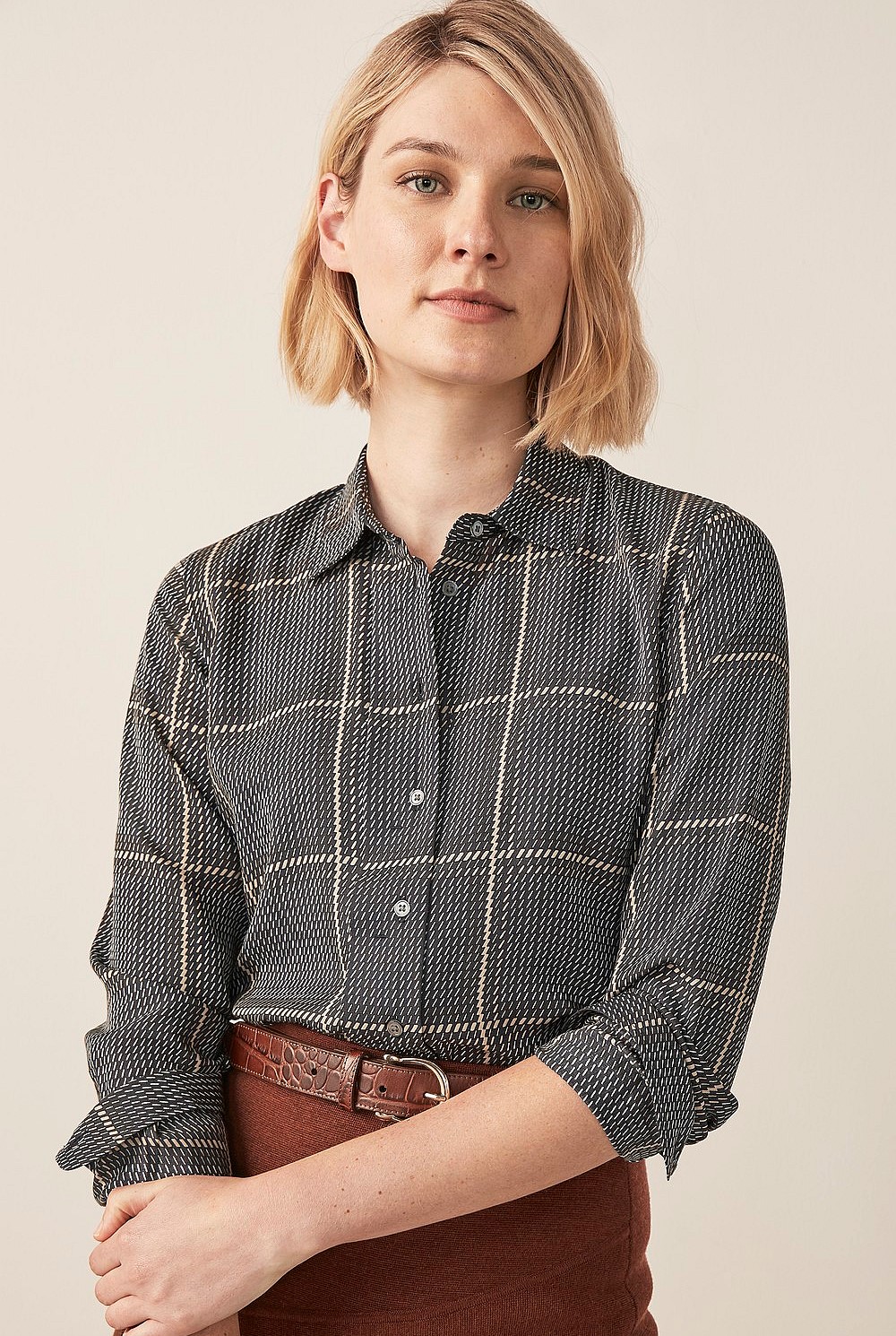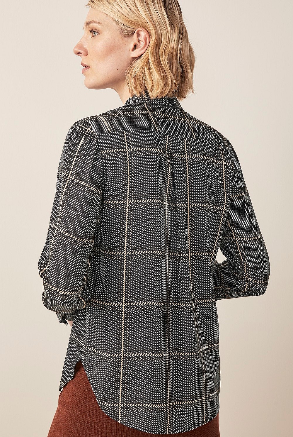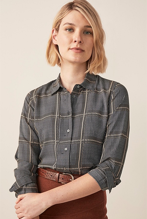 A printed shirt does the hard work for you when getting dressed. Ours is crafted in pure modal for a lightweight, smooth finish with long sleeves and a split curved hem. Featuring a reimagined check print in a palette of black, white and parchment shades; wear yours to dress up block coloured skirts or trousers. We love wearing it with cinnamon; this season's essential hue.
