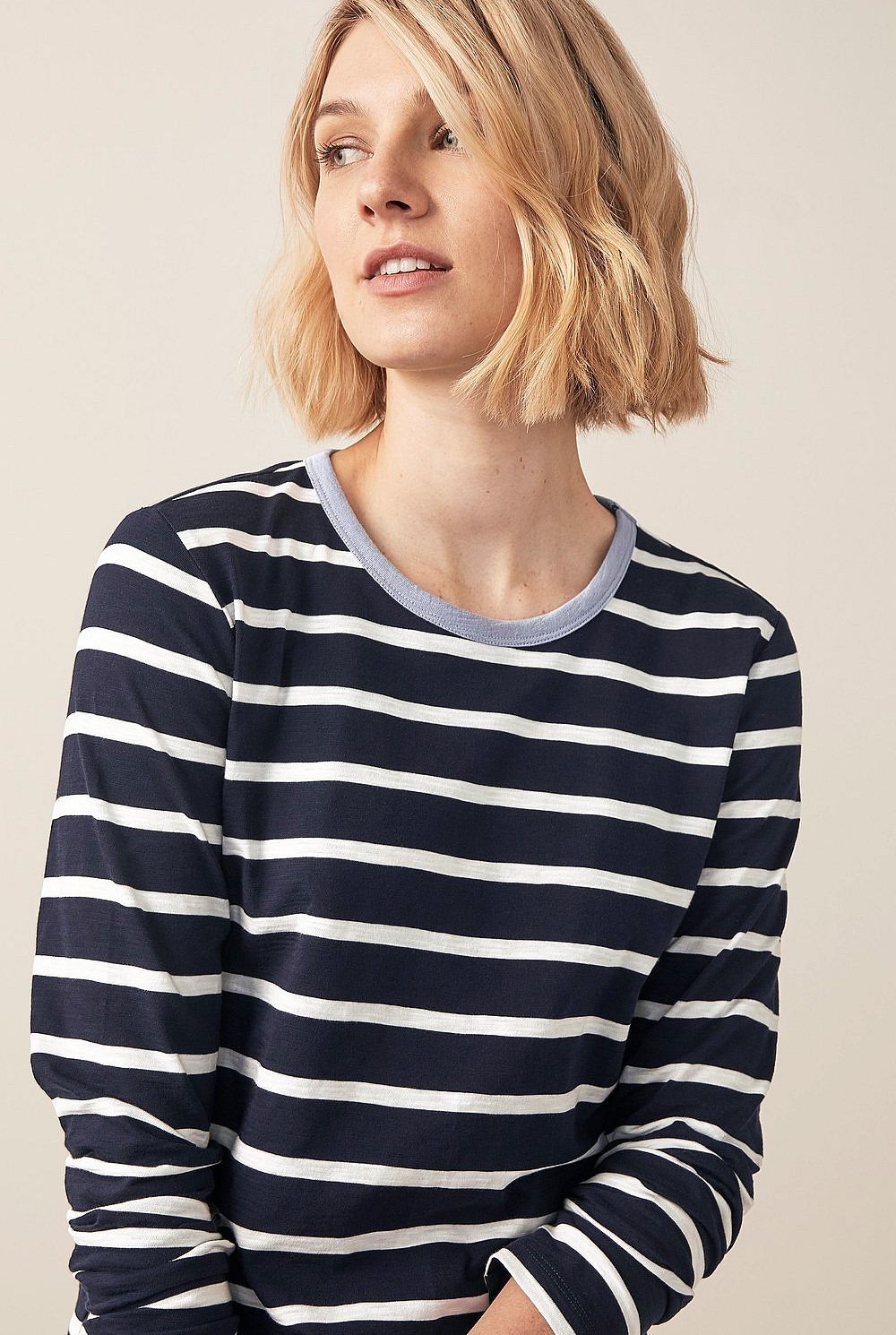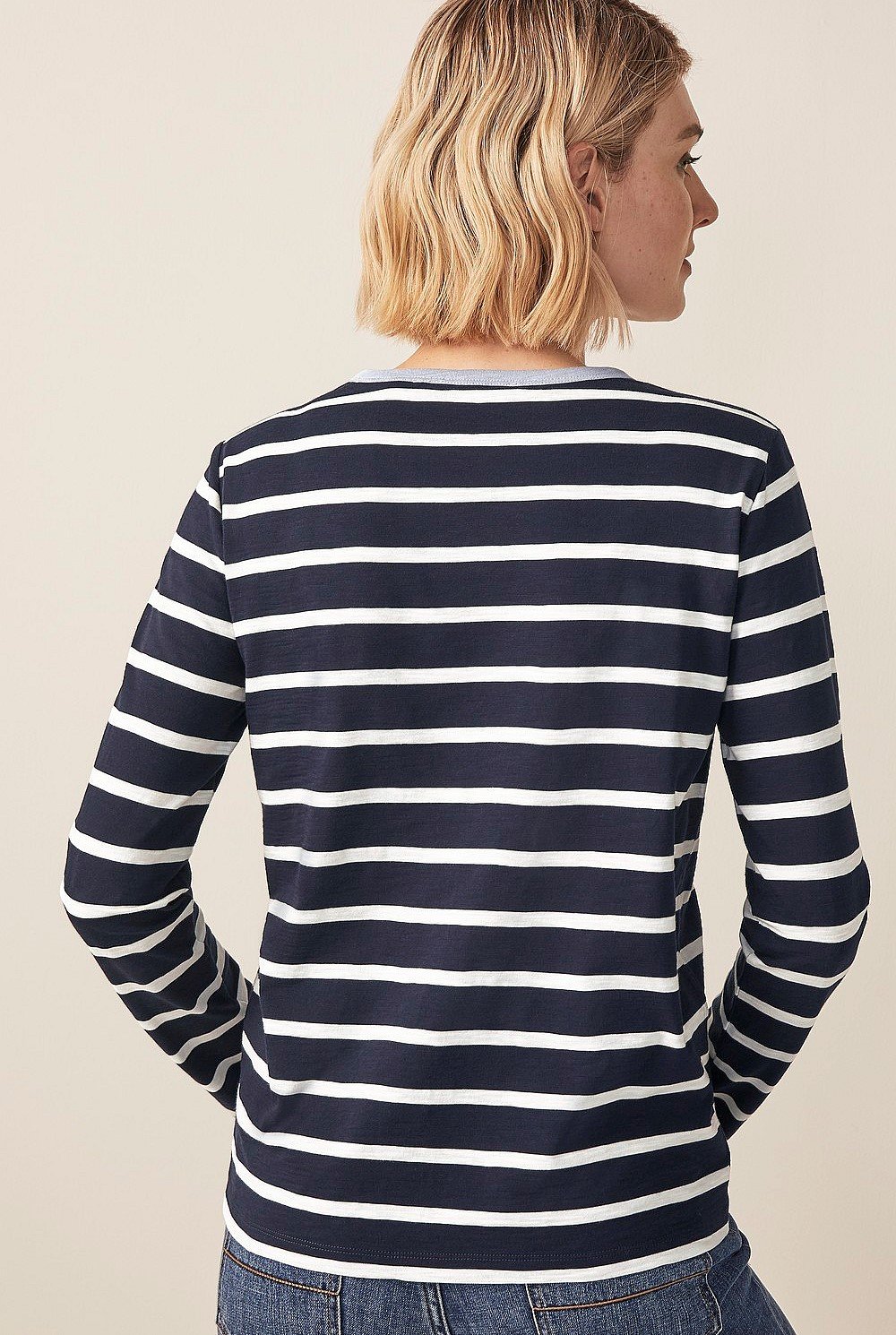 A weekend essential, this long sleeve t-shirt is crafted in pure organic cotton to sit smooth and comfortably on the skin. Featuring a stripe design, available in both red and navy hues. Wear with lounge pants or denim.