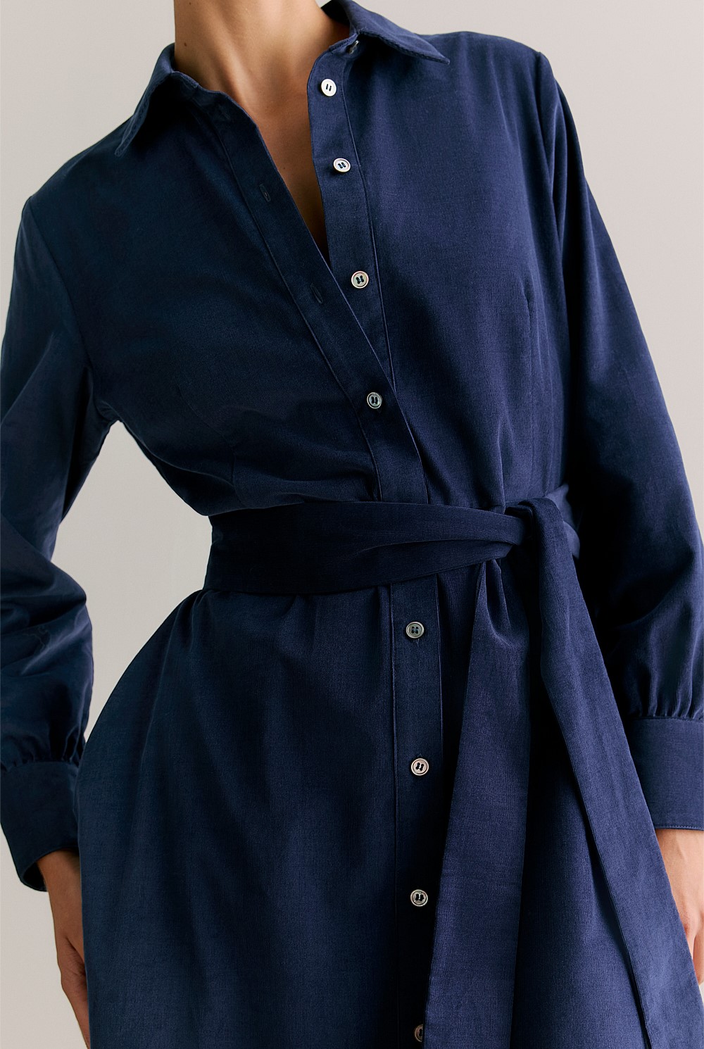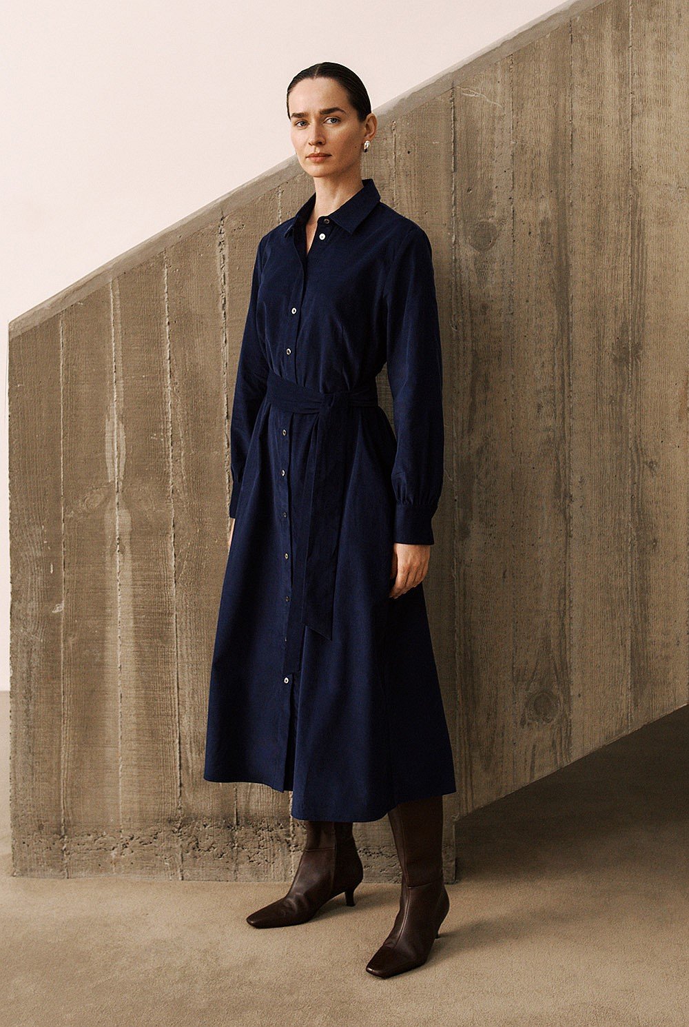 A classic shirt dress silhouette, crafted from ultra-fine cotton cord for subtle structure and a velvety feel.