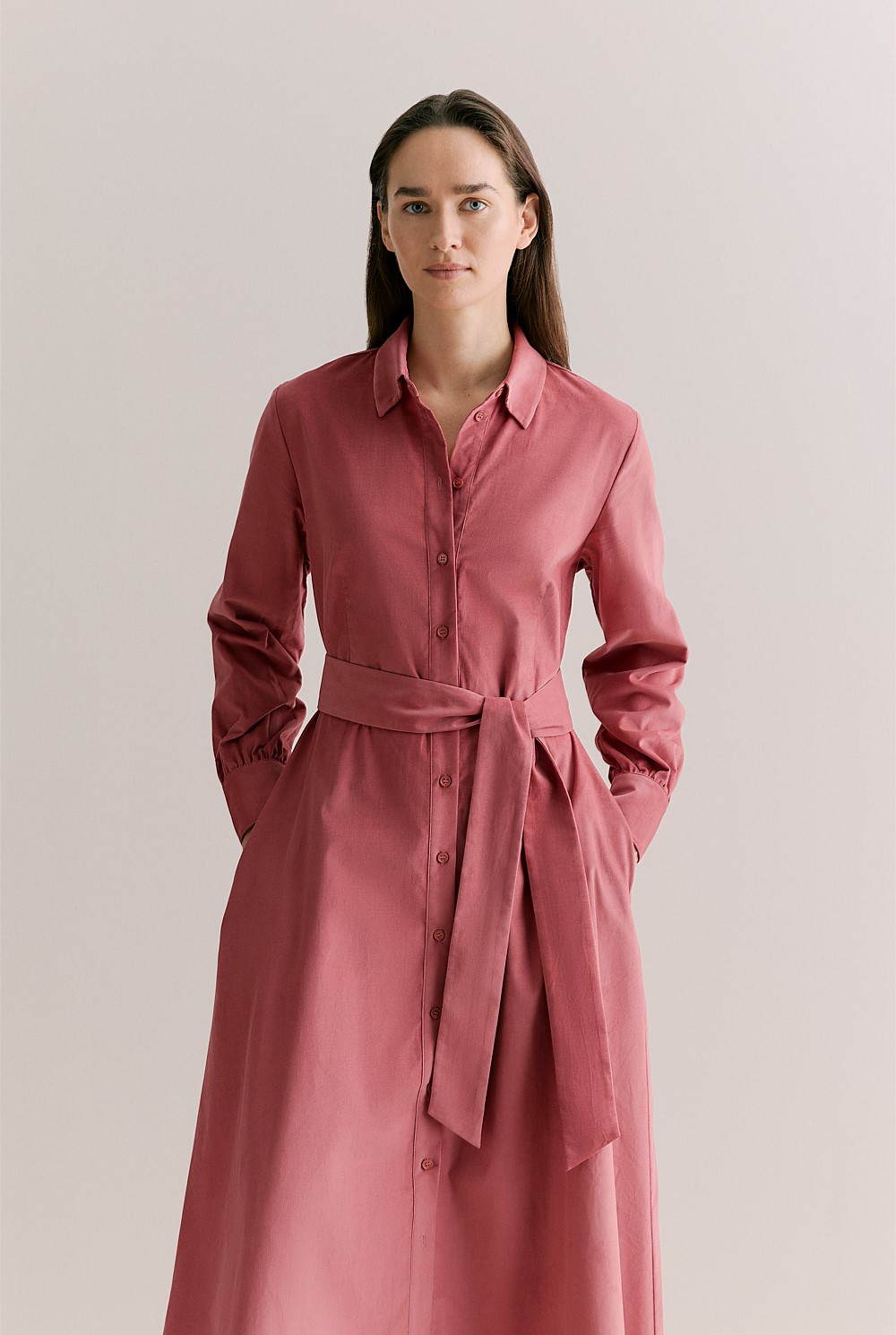 A classic shirt dress silhouette, crafted from ultra-fine cotton cord for subtle structure and a velvety feel.