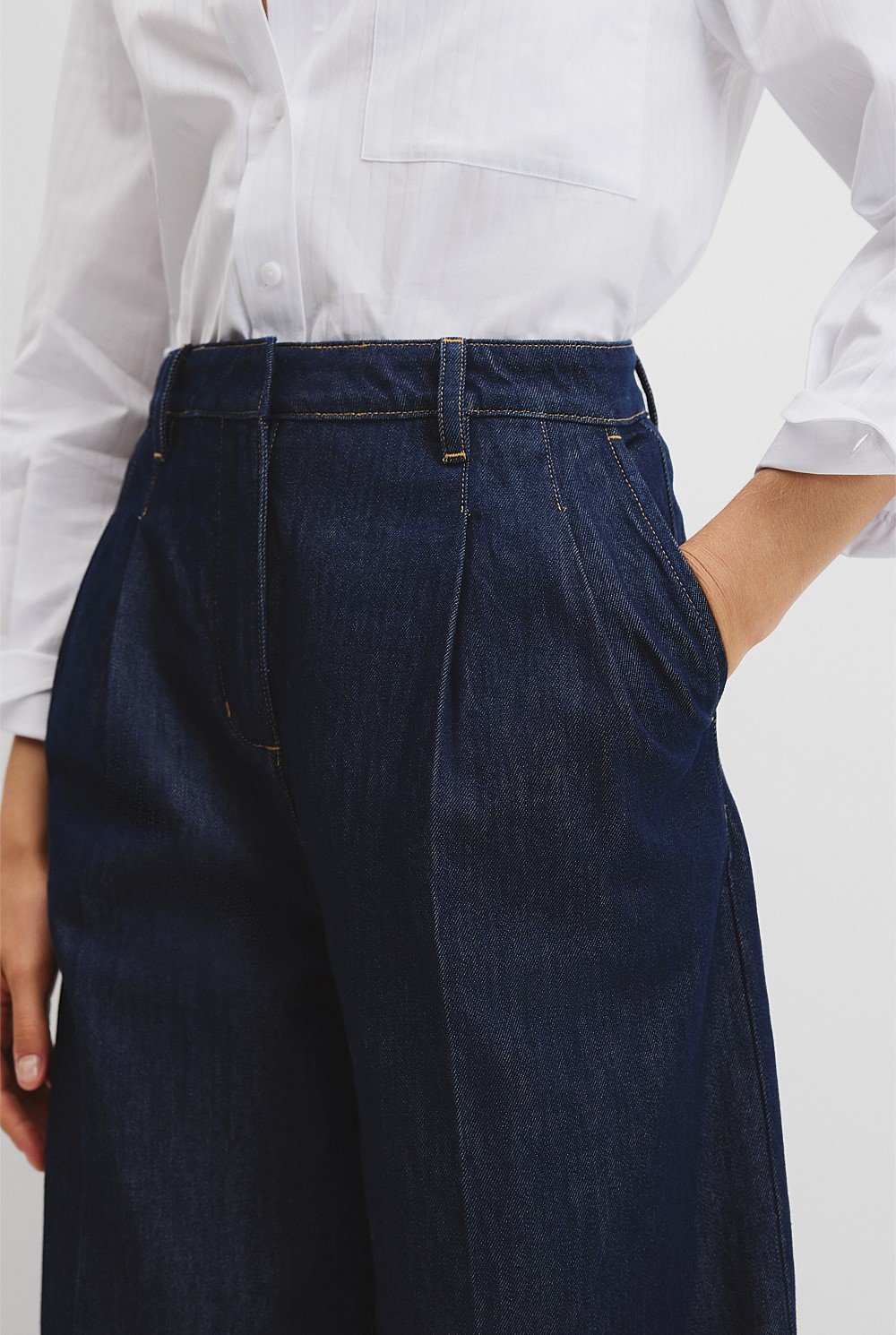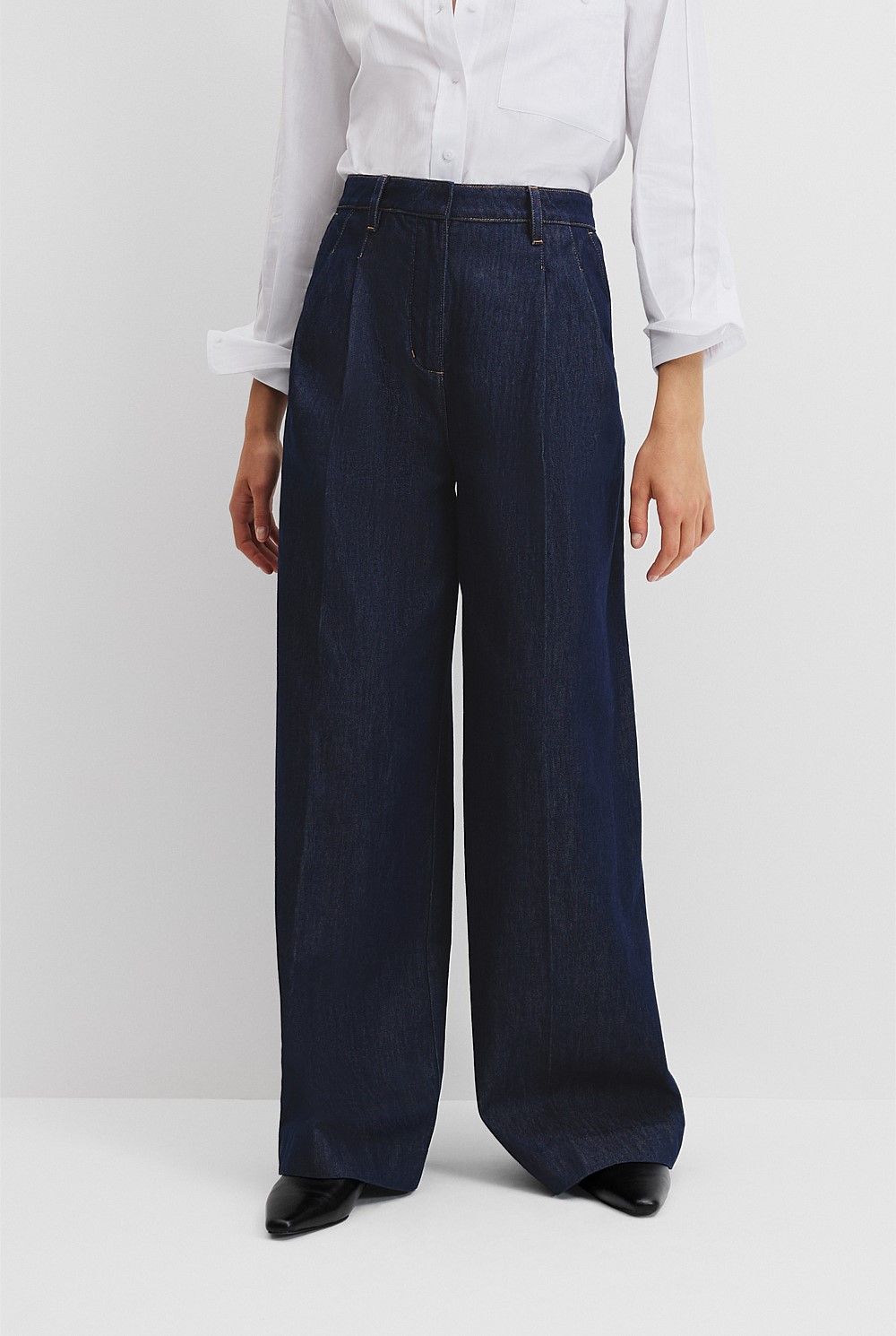 This tailored trouser is made using rigid denim for a structured hand feel. Designed to sit high on the waist, it features a wide leg and soft pleat detailing for a refined finish.