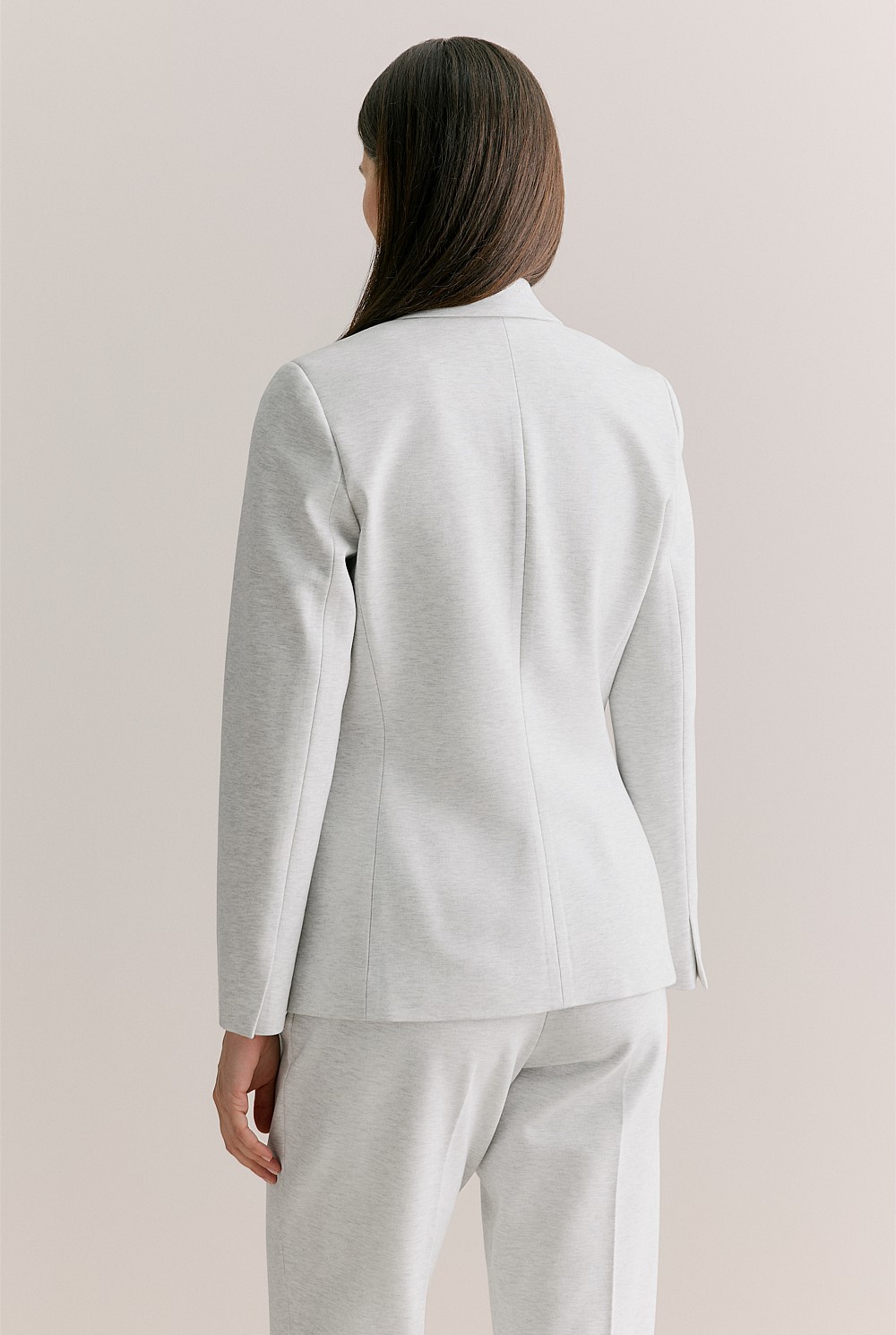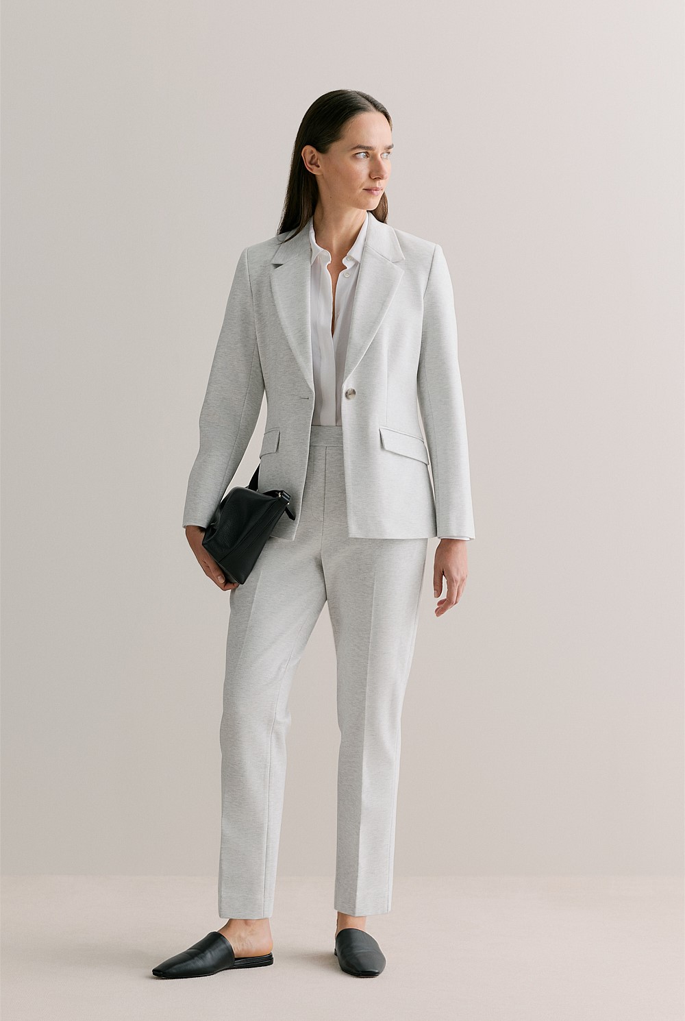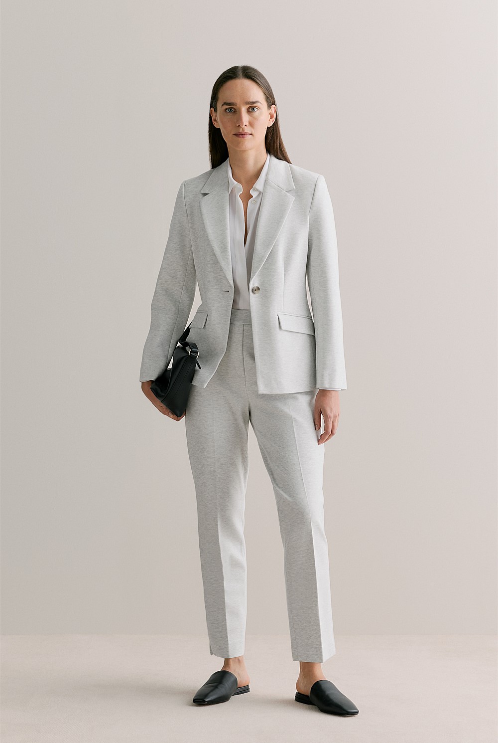 Our soft ponte blazer is crafted for polished ease—clean-lined and tailored with side panels to sculpt the silhouette.