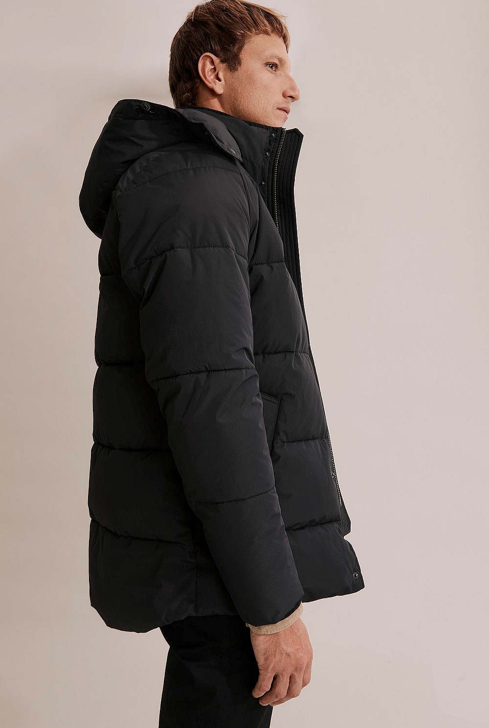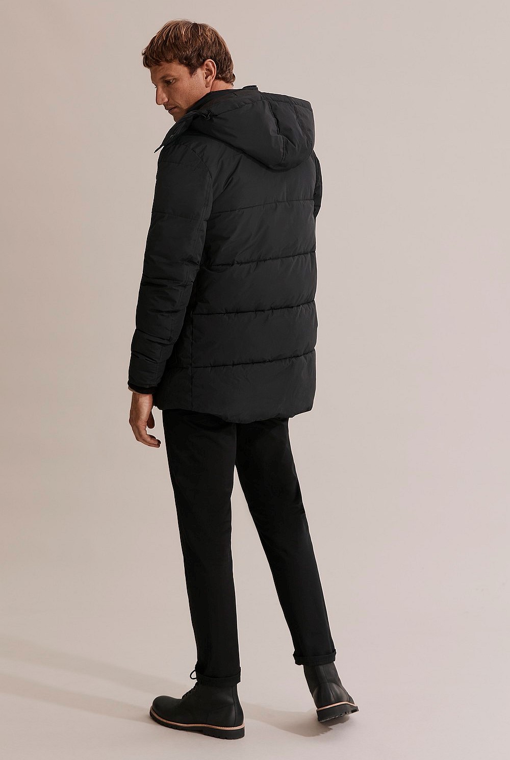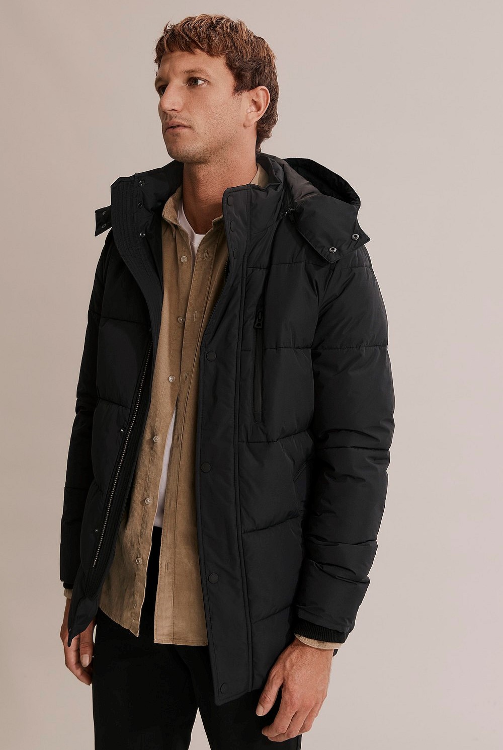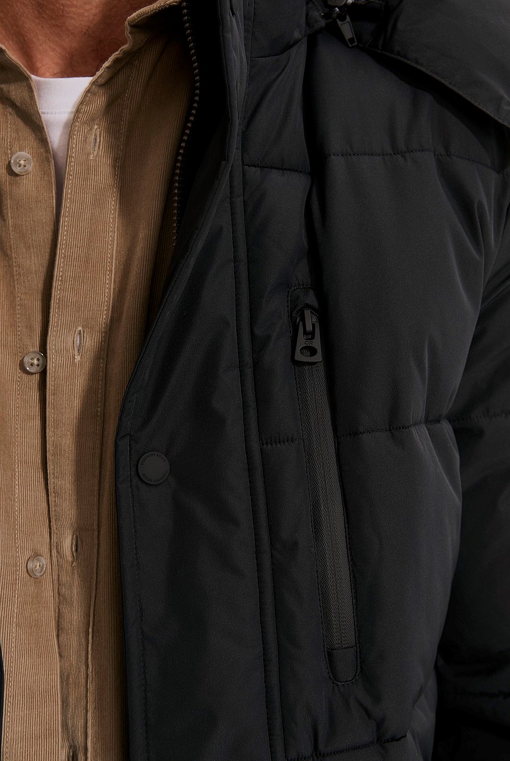 A classic parka for cooler days. This style is made using recycled polyester, with a zip front and snap buttons. It has a removable hood with drawcord, and pockets at the chest, side and internally.