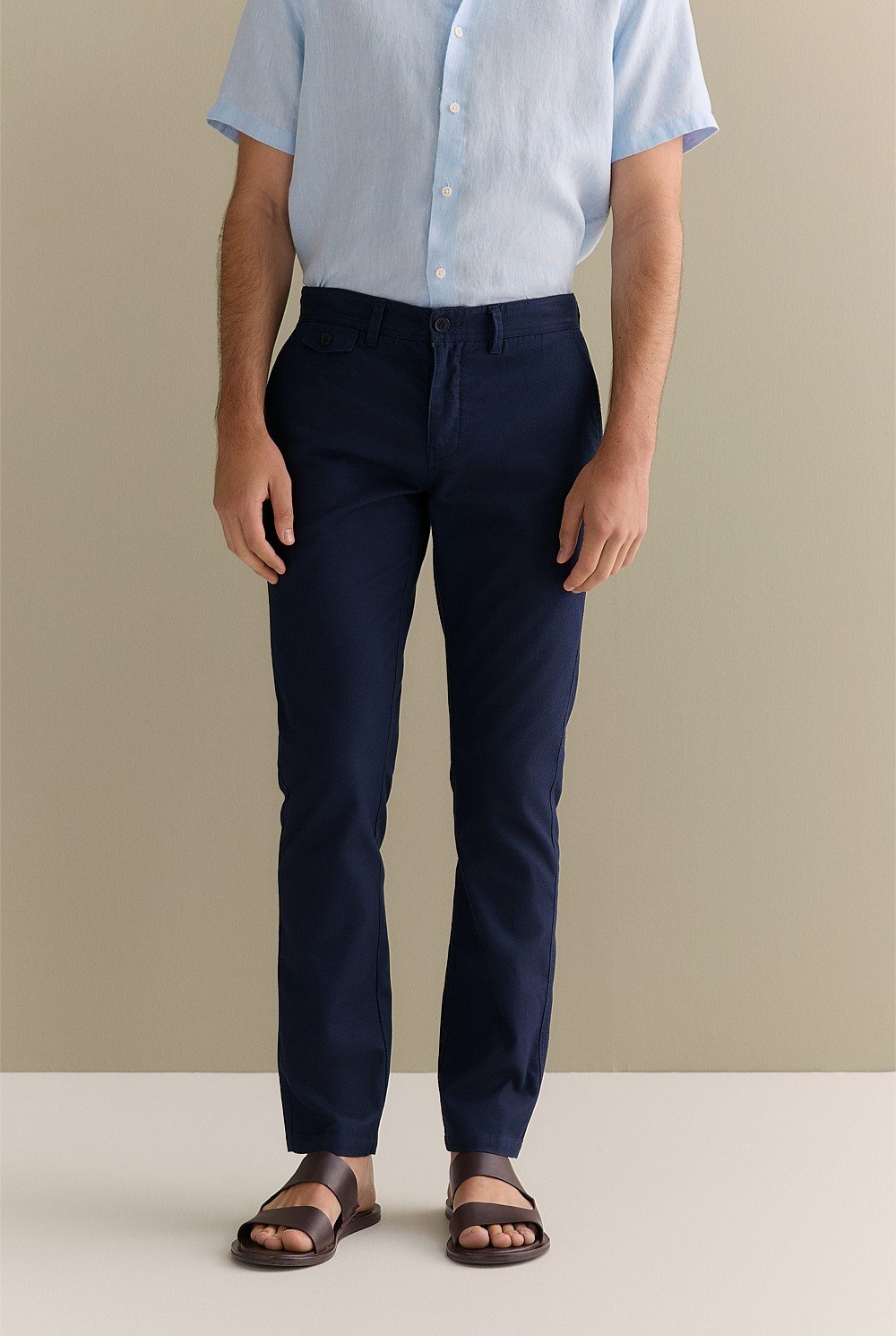 Crafted from soft cotton dobby twill with a hint of stretch, these chinos are cut for a slim fit with a narrow leg and tapered hem for a modern silhouette.
