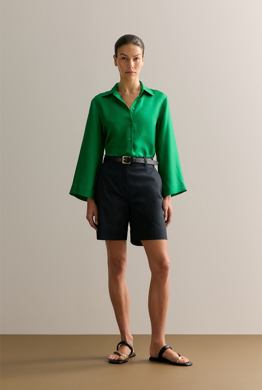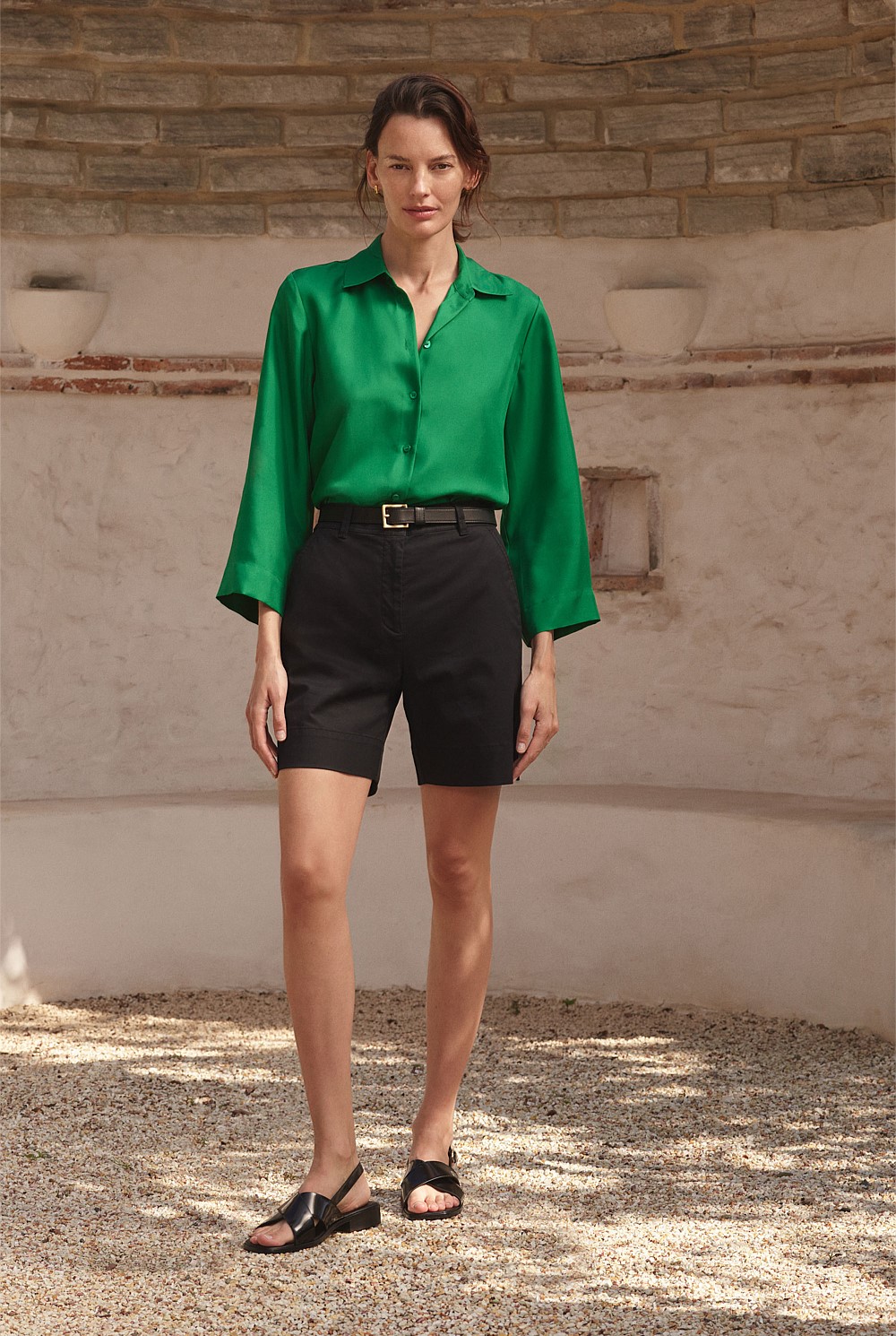 Our mid-length short is tailored from cotton double cloth, woven with stretch to give a smooth and neat fit. It's a straight fit, detailed with angled hip pockets, and belt loops for versatile styling.
