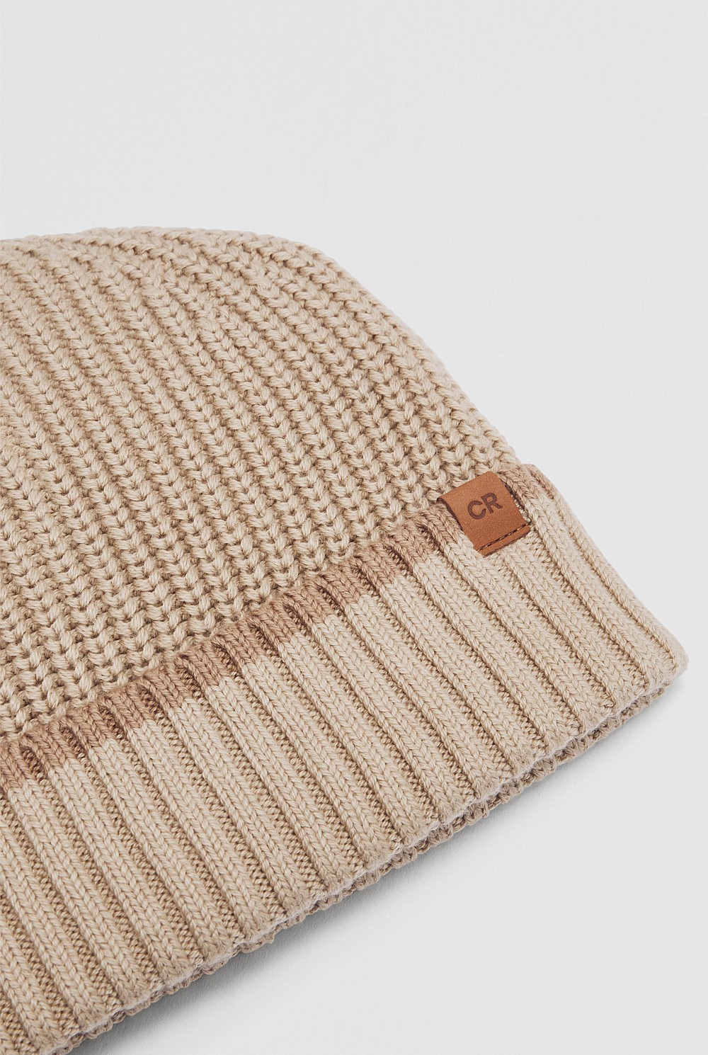 A chunky rib-knit beanie made using a cosy blend of organically grown cotton, wool and cashmere. It features a wide contrast stripe and is finished with a branded leather pip label.