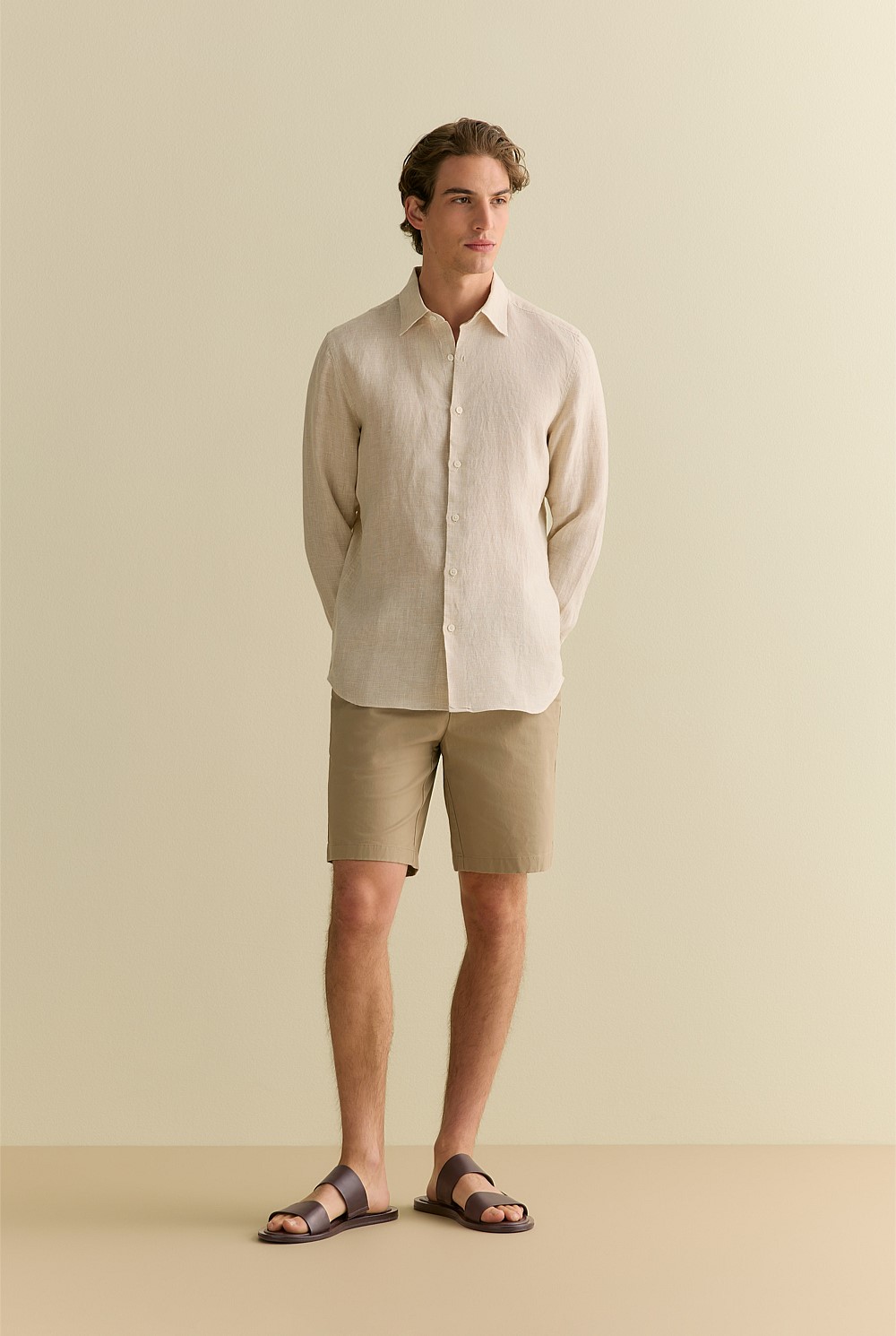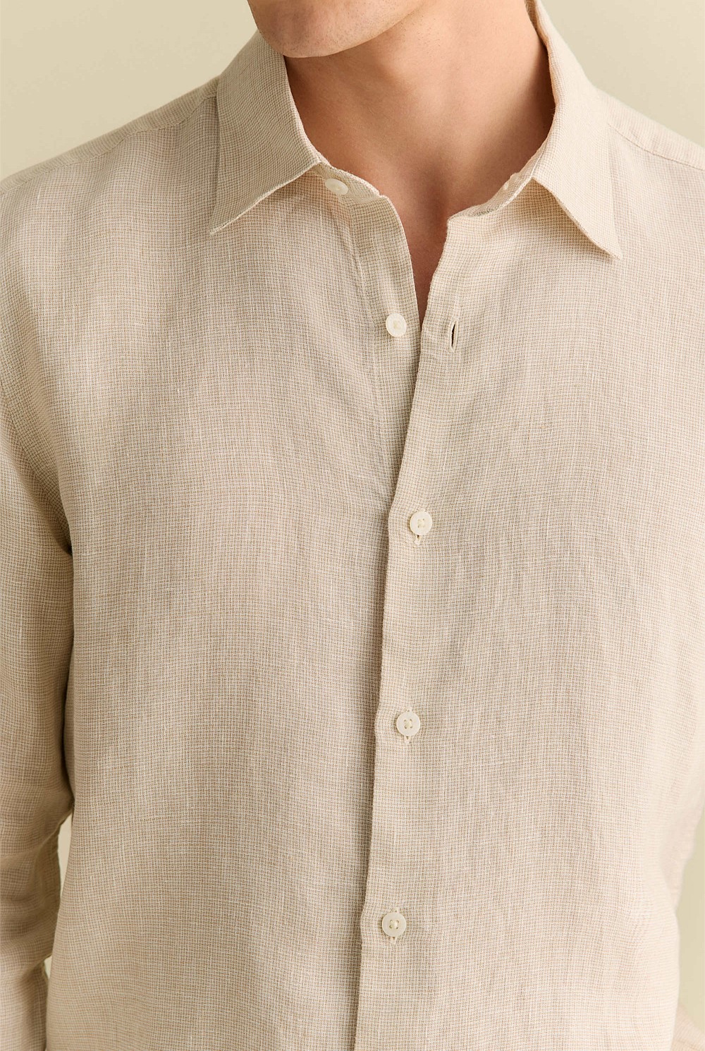 Tailored from French linen, this long-sleeve shirt features a slightly tapered waist and a basketweave texture, offering a refined, tactile finish.