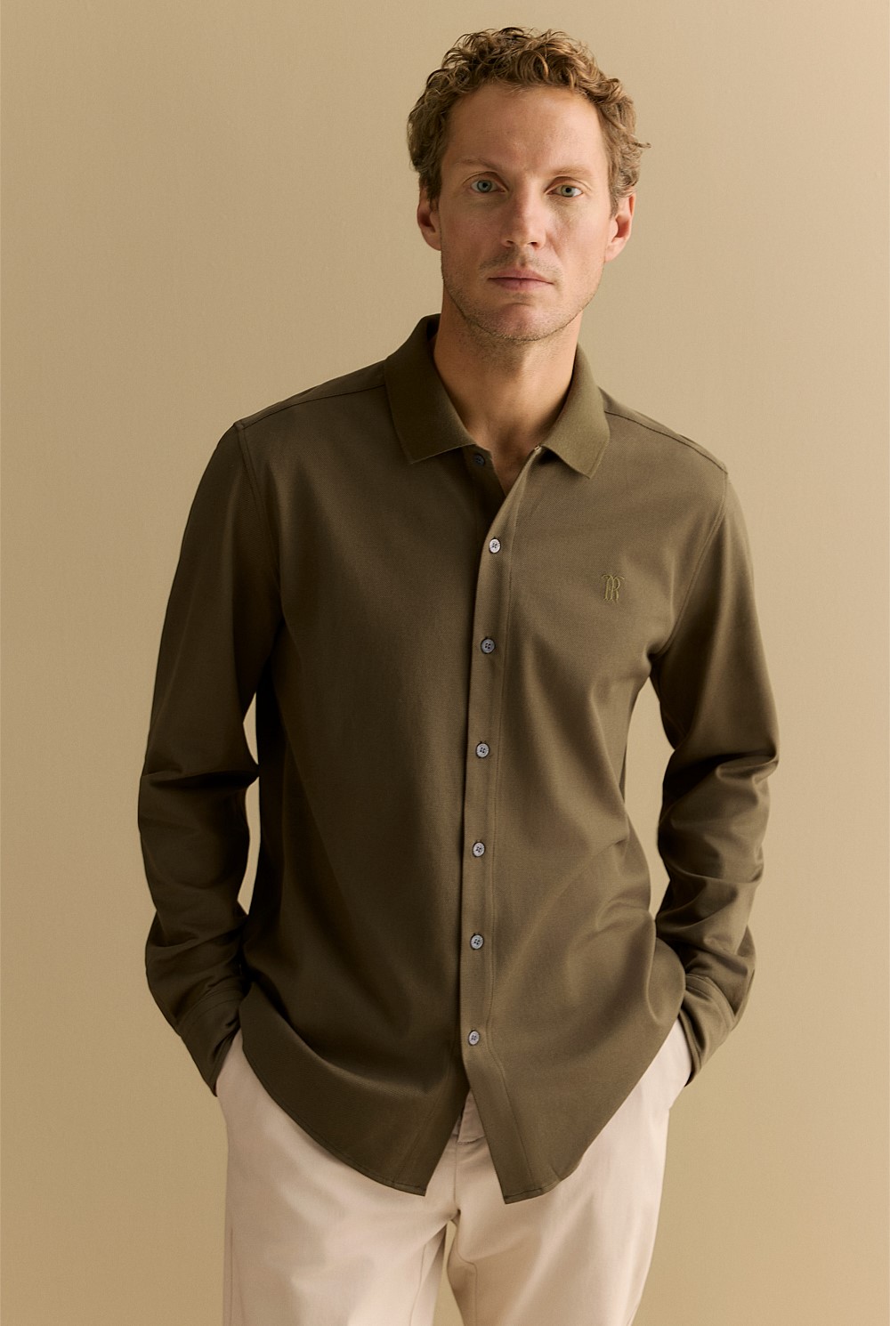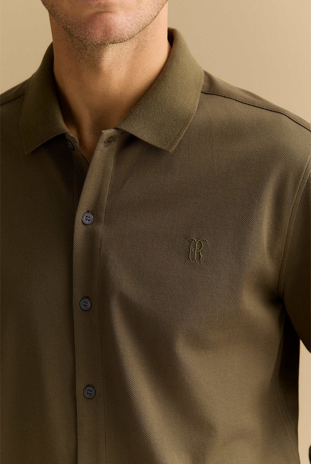 Crafted from long-staple pique cotton, this shirt balances structure and softness. Designed in our tailored fit with a ribbed collar and curved hem, it's subtly finished with a monogram embroidered at the chest.
