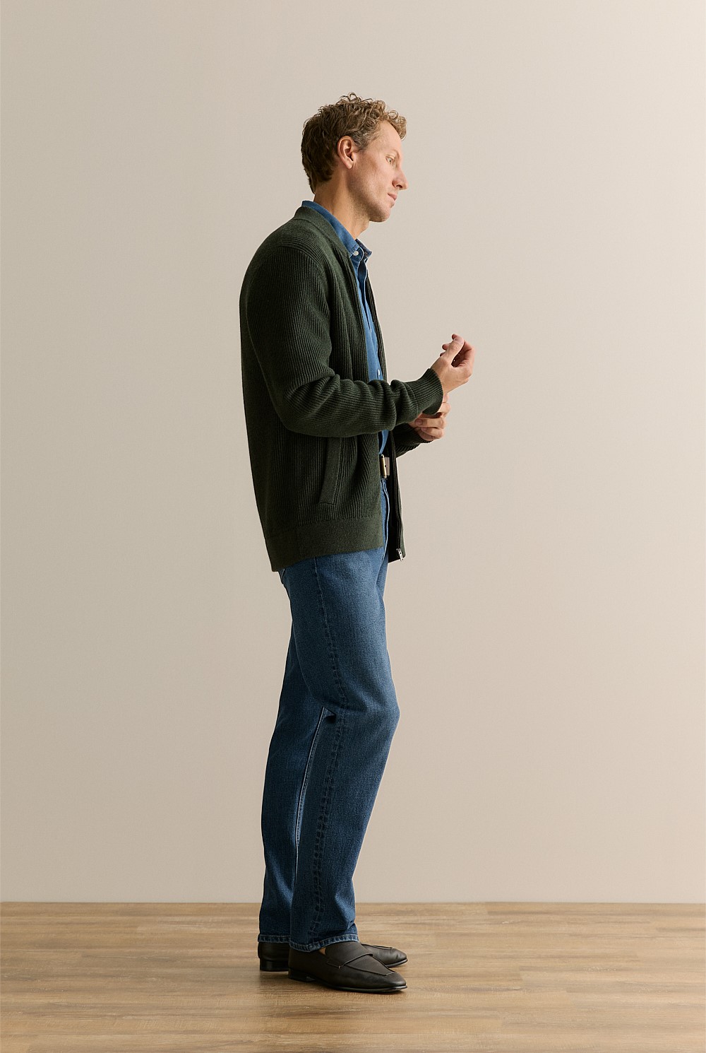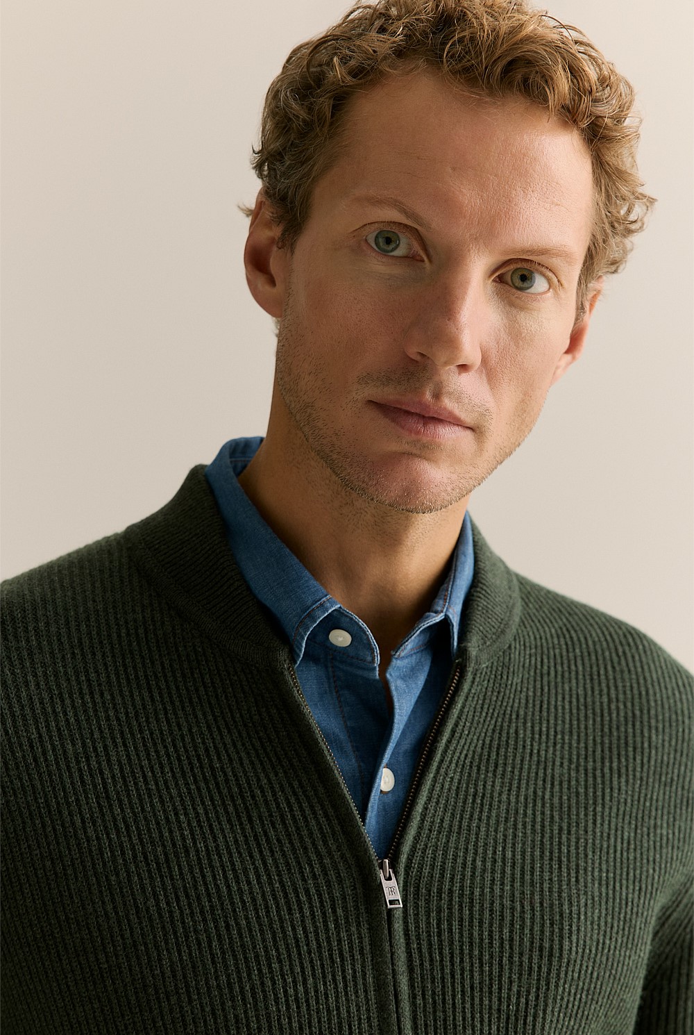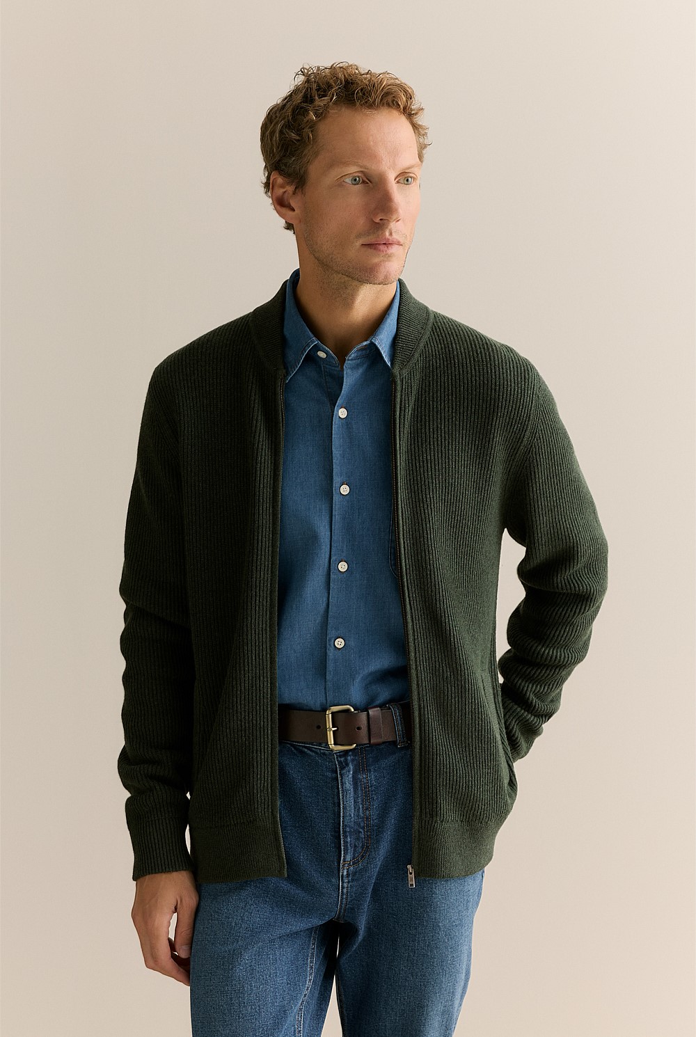 This midweight bomber blends cotton and wool in a half-cardigan knit for subtle texture. A modern layering piece, it's designed with a full zip, rib trims and pockets.